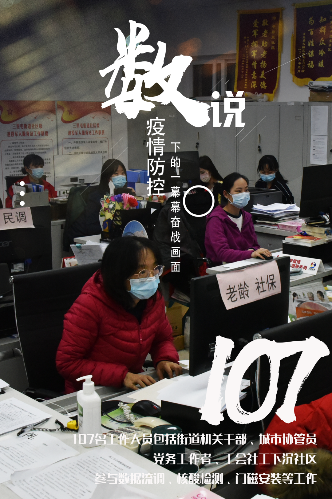 为缓解基层人手不足的压力,街道干部、城市协管员、党务工作者、工会社工等107名工作人员下沉社区,勇担防疫“急先锋”。大家各司其职,分工明确,操作熟练,配合默契,“数据组”人员大多是没有派单排查经验的“新人”,经过简单的培训后,大家即学即用,全面排查数据,完成关联人员信息数据处理、电话联系、同住人信息采集、信息转移,并全部纳入管控,为筑牢防疫安全墙提供有力支持。“检测组”承担上门入户核酸检测的任务,每一组上门检测都是由一名医护人员加一名街道工作人员“两两配对”完成,咽拭子检测是医护人员的本职工作,而扫码译码成为街道工作人员的必备技能。“管控组”人员在系统上预先录入居家隔离人员的姓名、家庭住址等基本信息,实现门磁对入户门的开关状态监控,两两组对为居家隔离人员入户安装智能门磁,来回往返,用脚步丈量防疫速度,以“人防+技防”手段助力疫情防控工作。