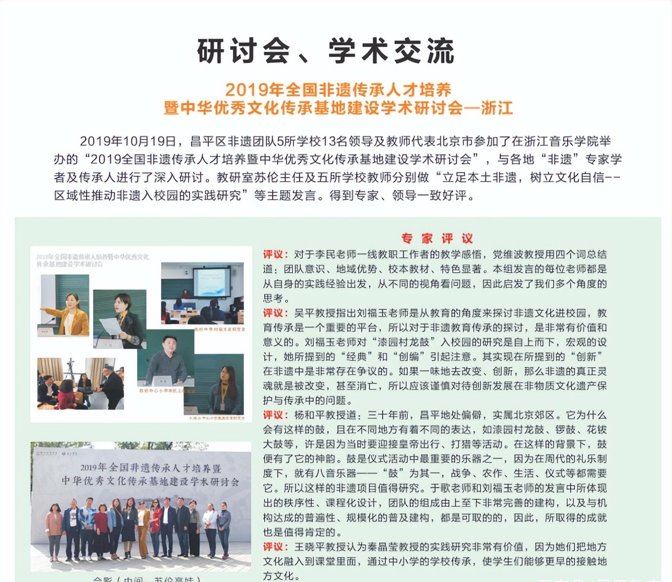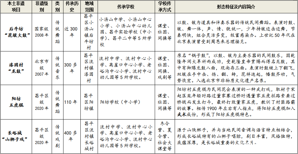 从2014年起至今,昌平区体美教研室在昌平区教委的大力支持下牵头组建非遗校园传承团队,聚焦区域内适合校园传承的四项本土艺术非遗项目挖掘,形成 “以美育人、以美化人、以美培元”的重要学校美育特色资源;提出“本土非遗校园活态传承”的目标;确立了从乡音乡情开始的“立足本土非遗守护精神家园”的区域美育共识;实践了本土非遗有效传承与美育教育改革相辅相成、相得益彰的路径。