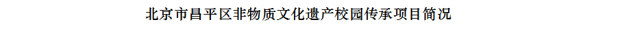 北京市昌平区“非遗入校园项目”是国家社会科学基金全国教育科学重点规划课题“中华优秀传统文化教育研究”的子课题内容之一,也是由区体美教研室主持的市级课题“区域性推动非遗项目进入中小学校园的价值与策略研究”的研究内容。