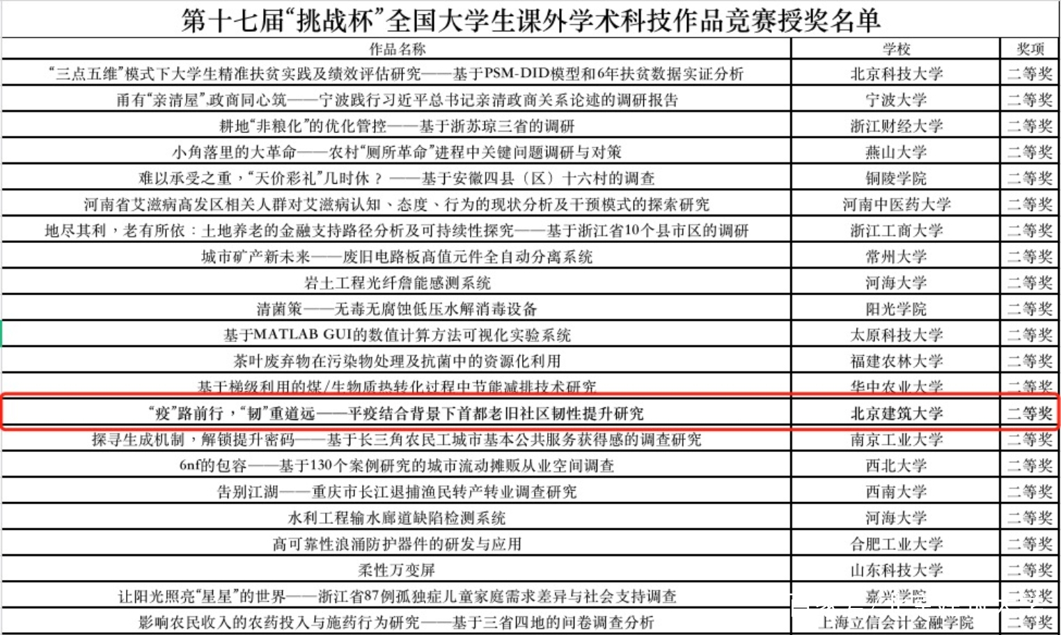 经统计,本届国赛就内地作品共评出特等奖作品49件、一等奖作品109件、二等奖作品320件、三等奖作品755件。北京地区高校中,获得二等奖及以上奖项共有13所,其中市属高校3所。在建筑类高校中,西建大及我校成绩位列第一、二位。