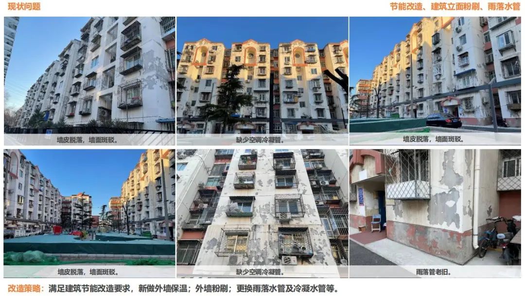 作为典型的老旧小区,西福村社区-体委9号院主要存在楼本体节能不达标,墙面破损渗水、楼内上下水管道年久失修、交通无序、停车难、环境品质低、缺乏社区文化、架空飞线凌乱、配套服务设施不足等问题。