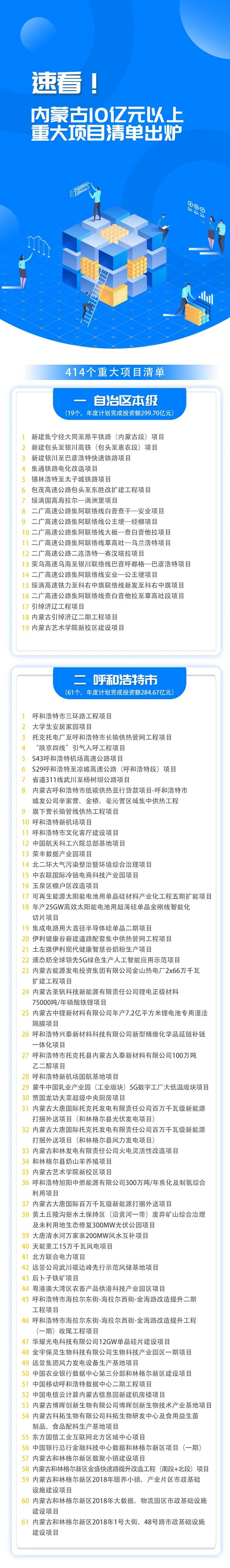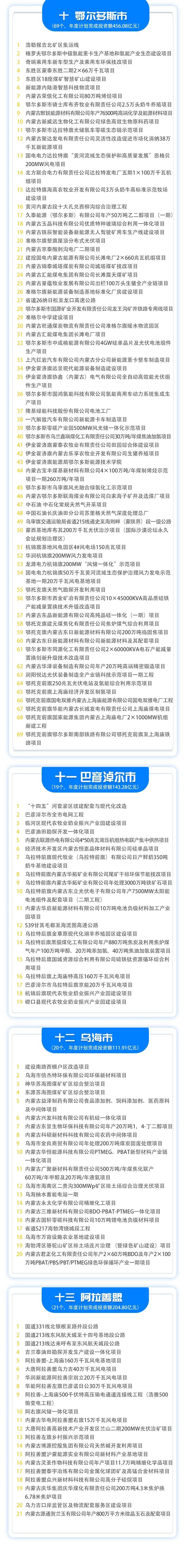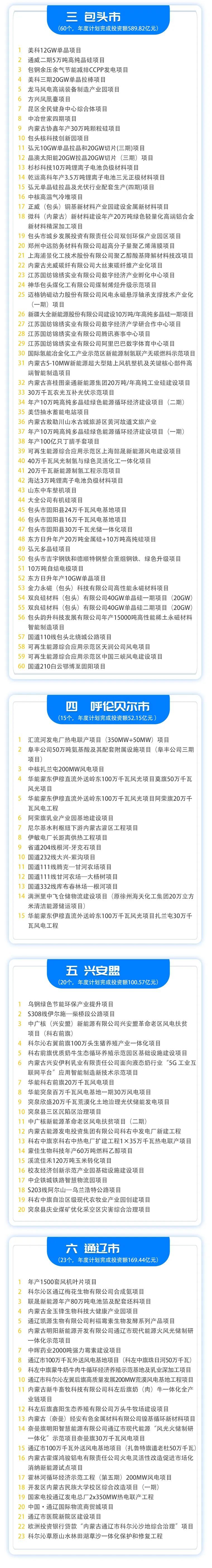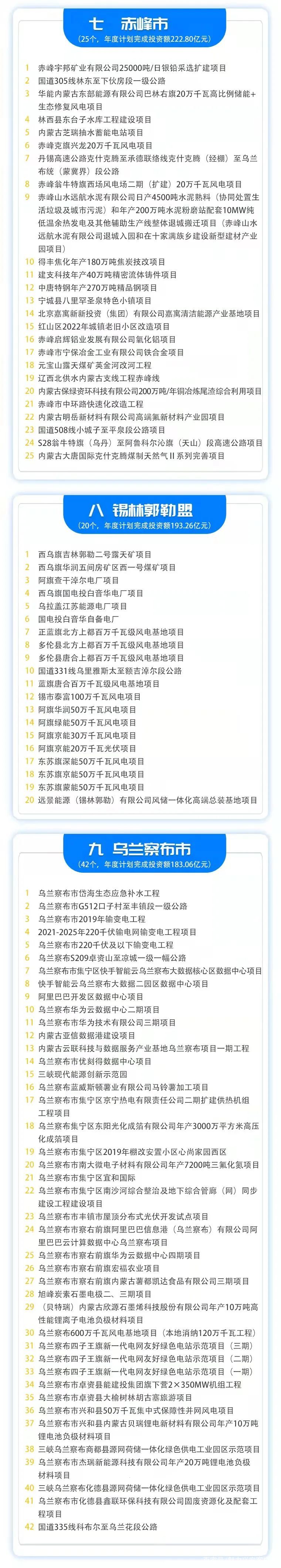 分盟市看,呼和浩特市计划实施项目61个,包头市60个,呼伦贝尔市15个,兴安盟20个,通辽市23个,赤峰市25个,锡林郭勒盟20个,乌兰察布市42个,鄂尔多斯市69个,巴彦淖尔市19个,乌海市20个,阿拉善盟21个。