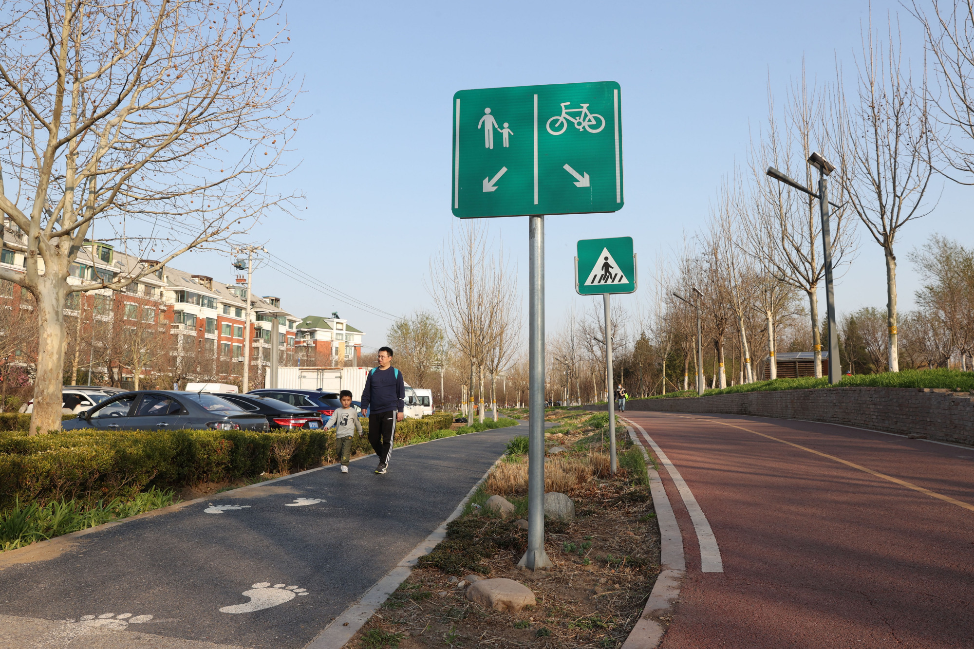 凉水河滨河公园绿道,骑行道和步道并行,共同组成了绿道系统。
