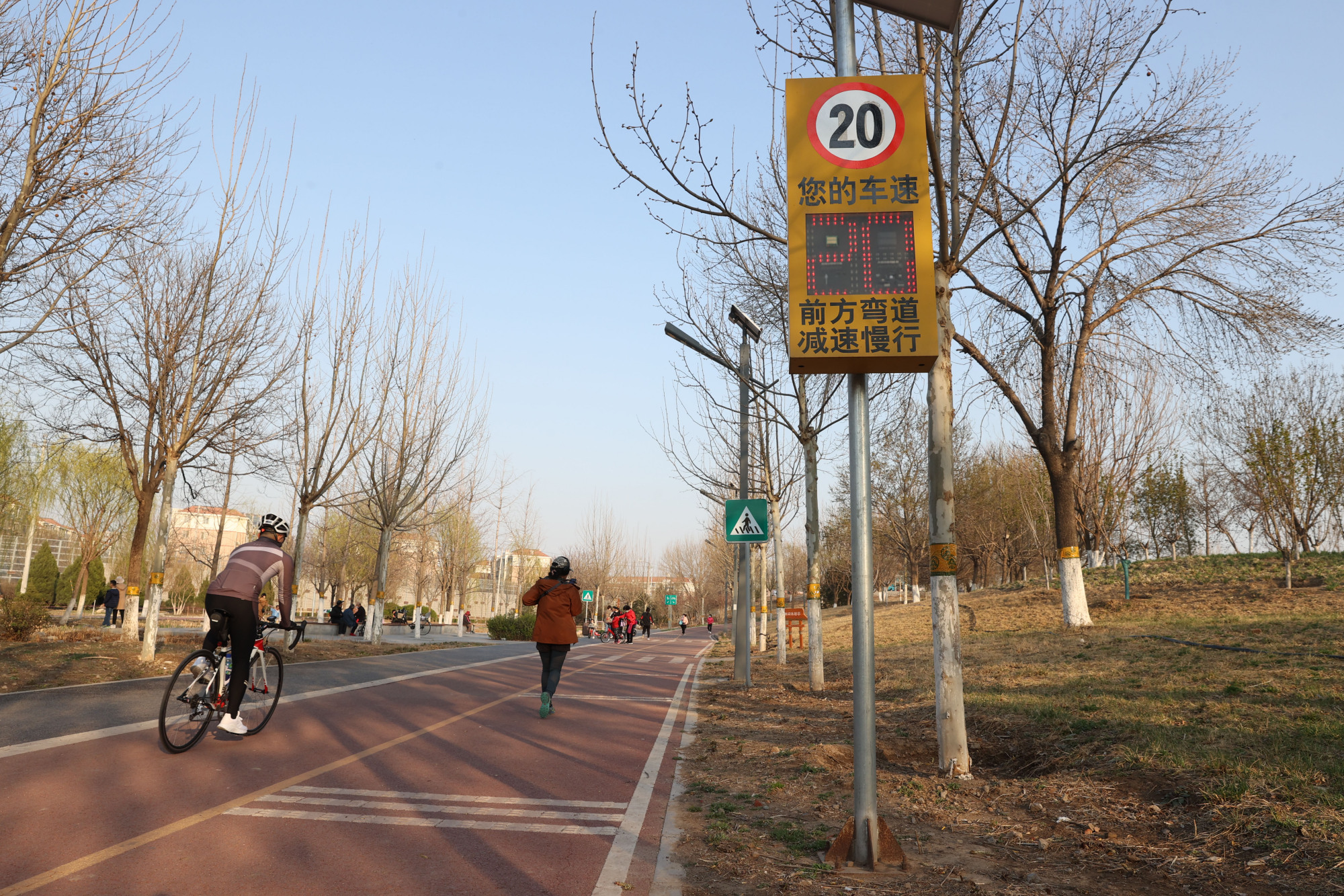 凉水河滨河公园绿道,这里的骑行道边设置了雷达测速仪,方便骑手们调整自己的骑行速度。