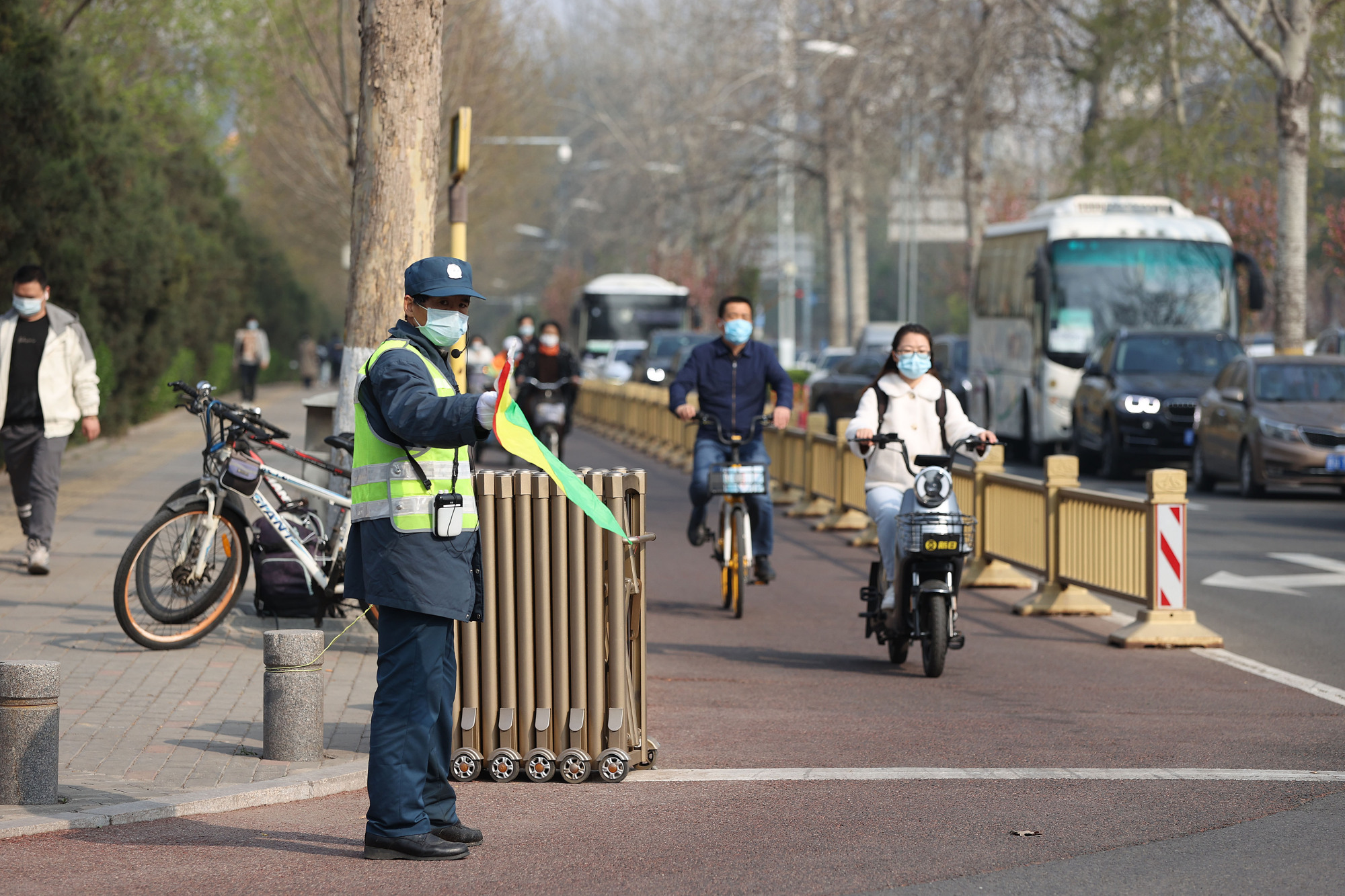 早高峰的荣华路,路口有专人负责绿道的通行秩序。