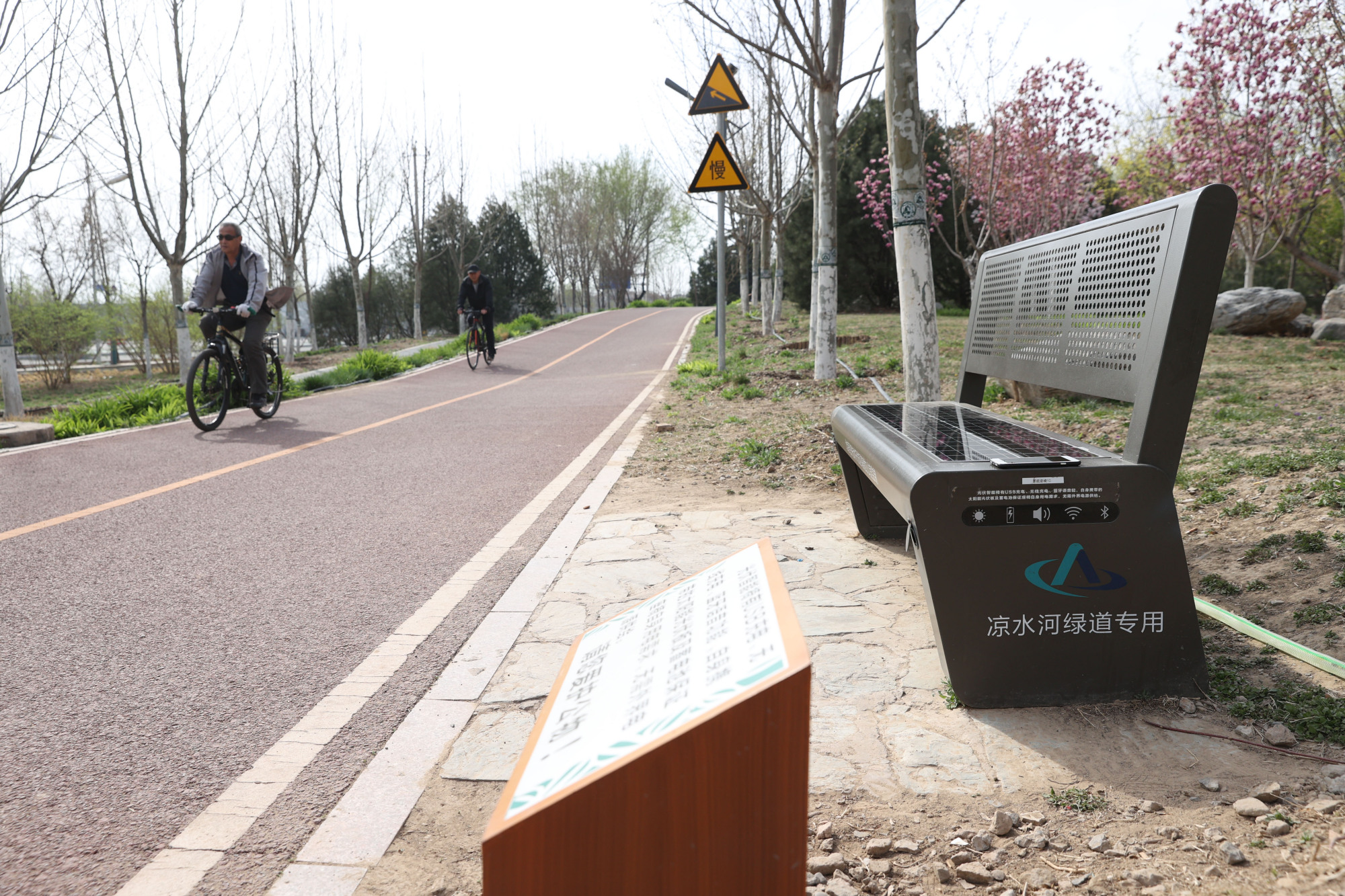 凉水河滨河公园绿道,路边的“黑科技”座椅。这种安装了太阳能充电系统的座椅可以给手机无线充电。