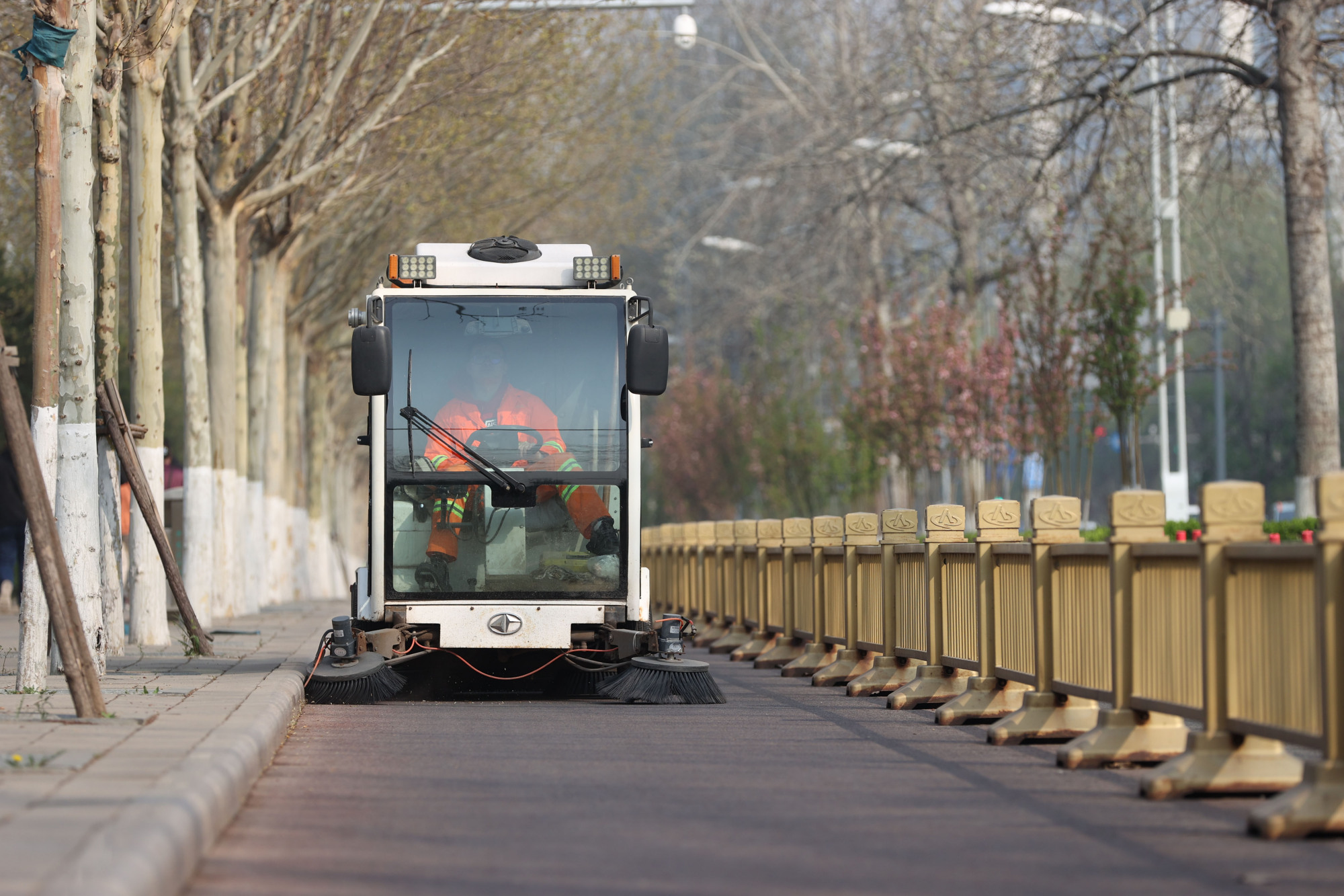 荣华路北,一辆清扫车正在清扫绿道。