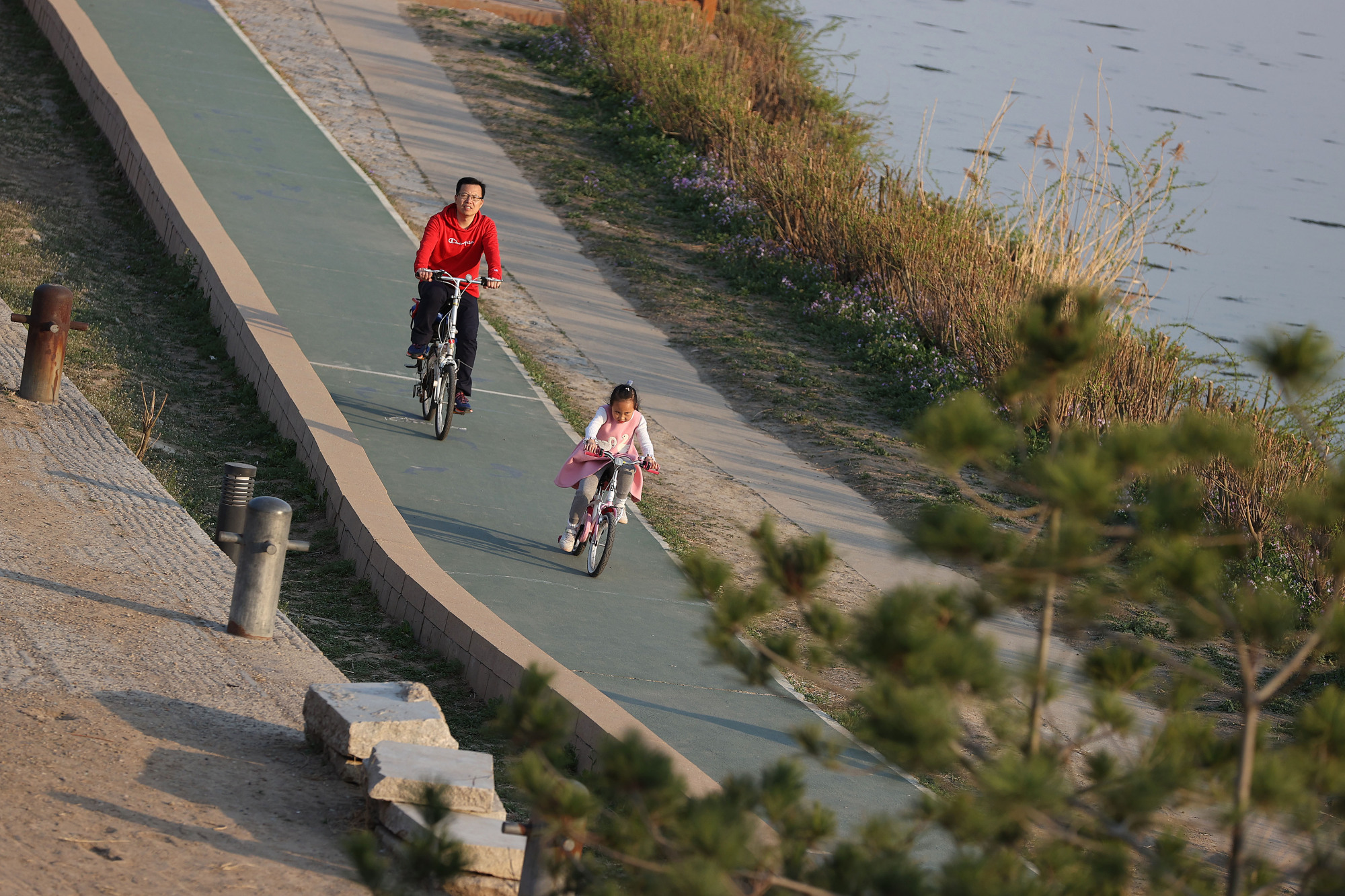 凉水河滨河公园河畔绿道,一位家长带着孩子骑行游玩。