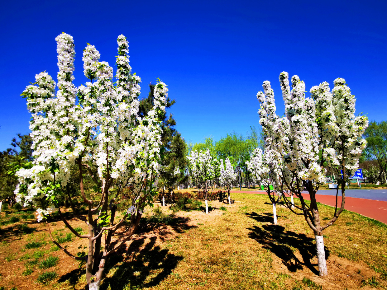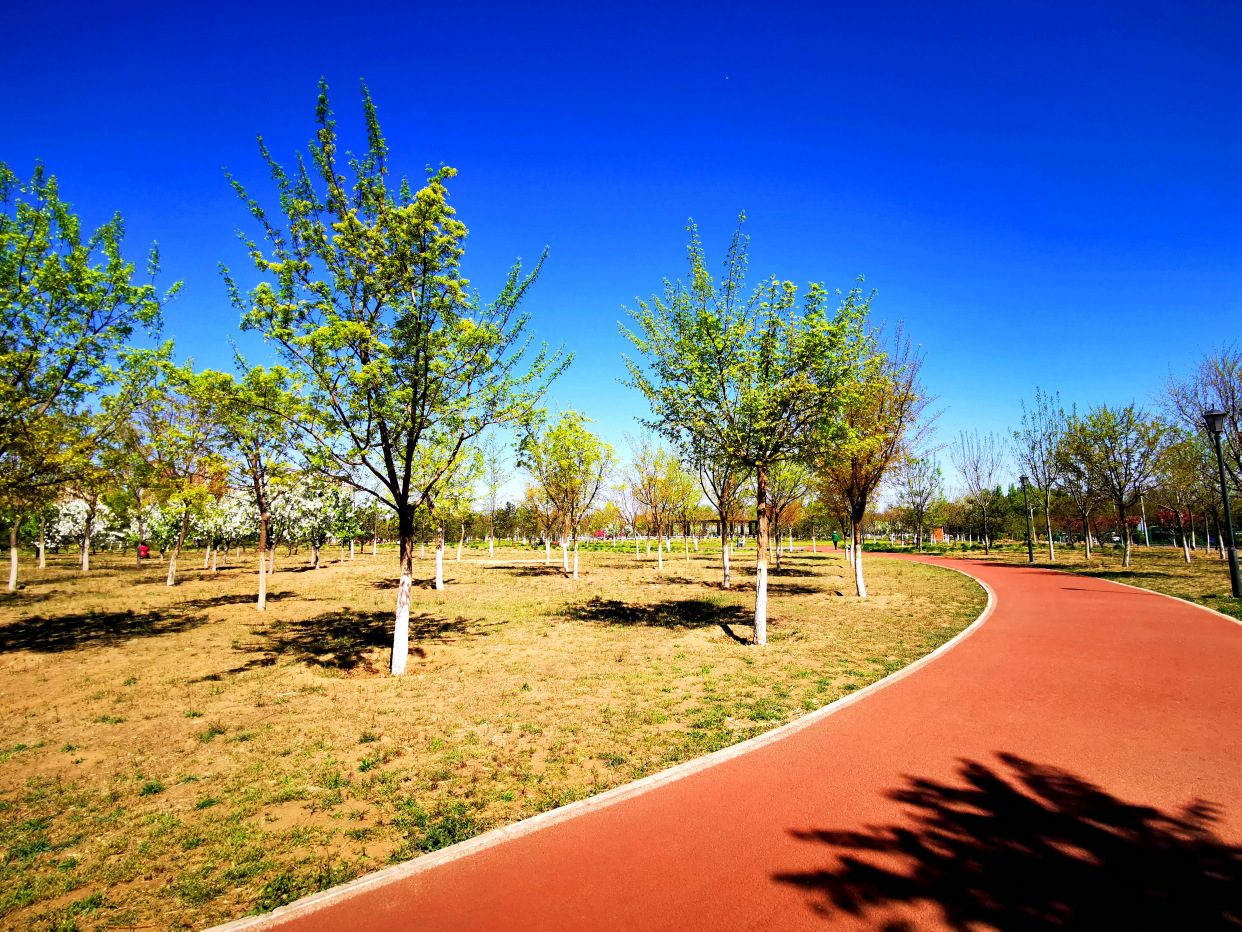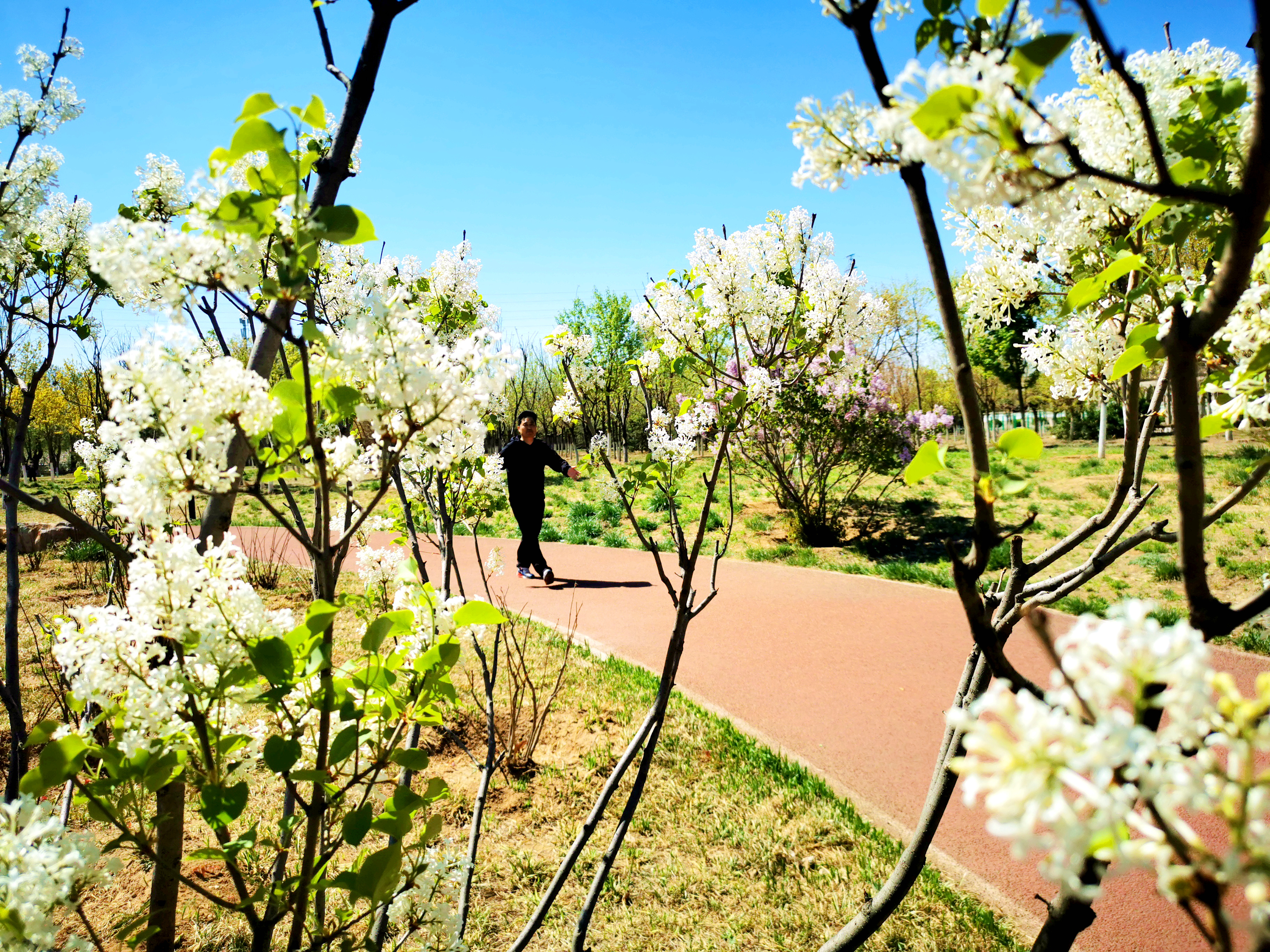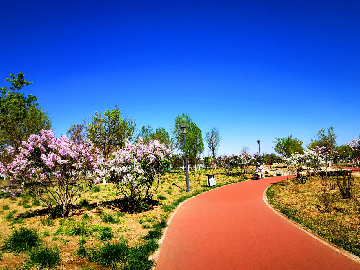 天晴得像一张蓝纸,几片薄薄的白云,像被阳光晒化了似的,随风缓缓浮游着。记者来到白盆窑休闲公园,进入公园,一条红色的健身步道蜿蜒伸向远方,三三两两的游人在春日绿植花海间倘佯,有跳广场舞的、有吹萨克斯的,有在花间拍照的、还有一展歌喉的,一派休闲惬意景象。眼下,梨花和丁香开的正盛,仿佛比着彰显自己的颜色,怒放着生怕落后。景色宜人,闹中取静,非常适合周边的百姓前来锻炼散步。