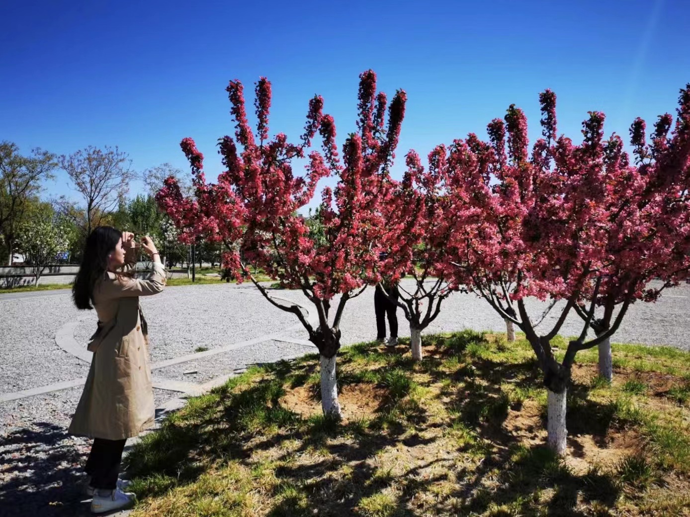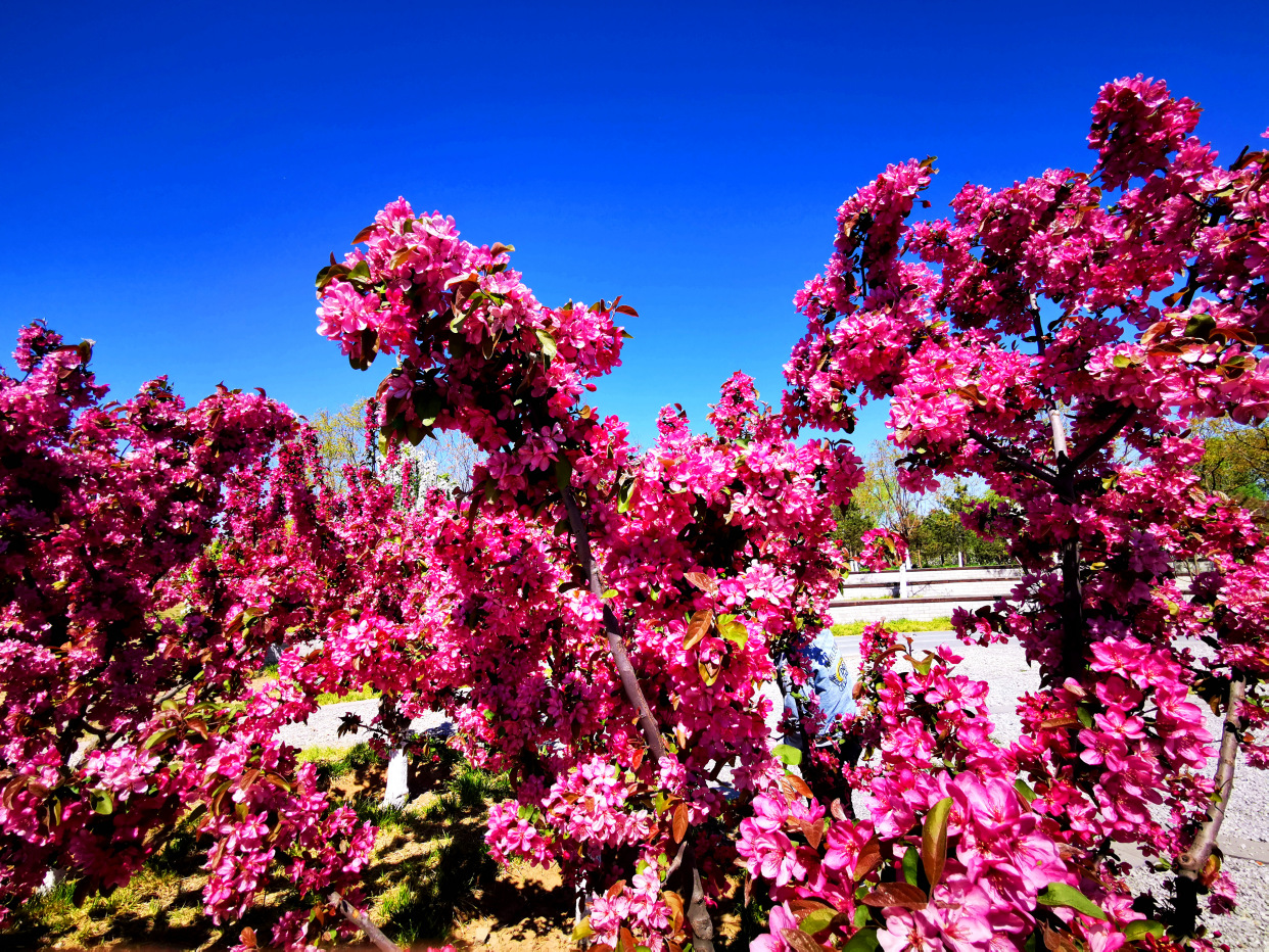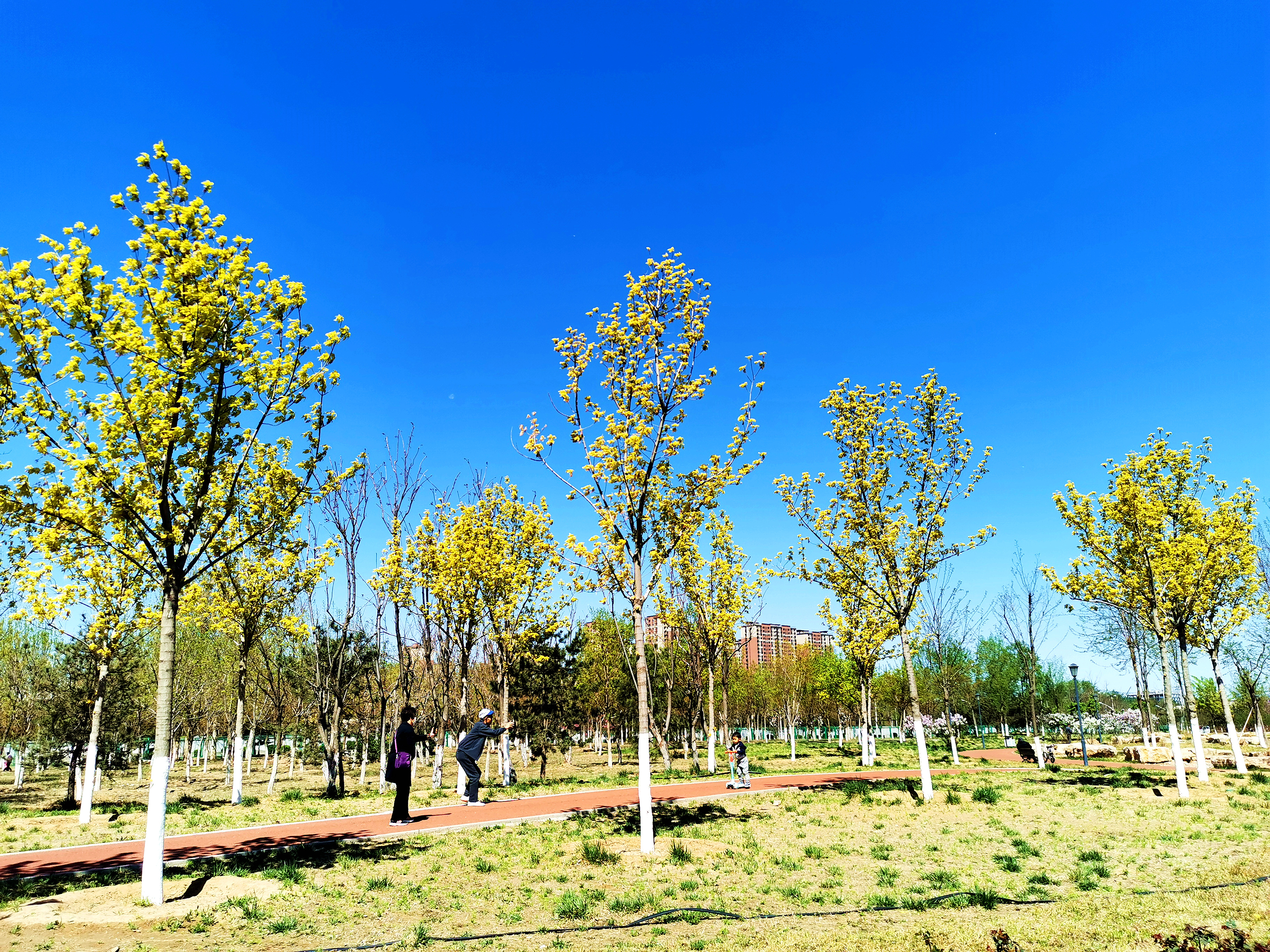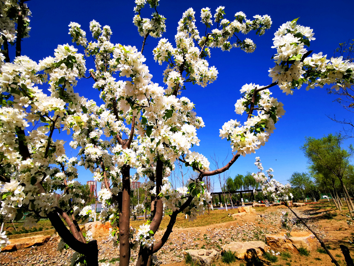 天晴得像一张蓝纸,几片薄薄的白云,像被阳光晒化了似的,随风缓缓浮游着。记者来到白盆窑休闲公园,进入公园,一条红色的健身步道蜿蜒伸向远方,三三两两的游人在春日绿植花海间倘佯,有跳广场舞的、有吹萨克斯的,有在花间拍照的、还有一展歌喉的,一派休闲惬意景象。眼下,梨花和丁香开的正盛,仿佛比着彰显自己的颜色,怒放着生怕落后。景色宜人,闹中取静,非常适合周边的百姓前来锻炼散步。