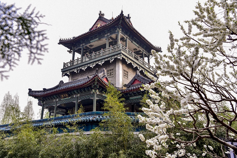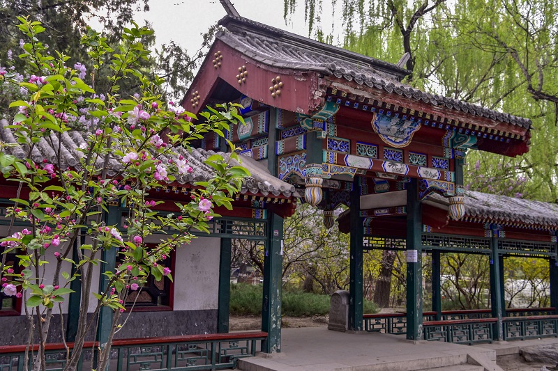 在昌平公园内,静静地湖水倒映着岸边的花树,楼台亭阁被花海包围。步行园中,静谧而舒畅。