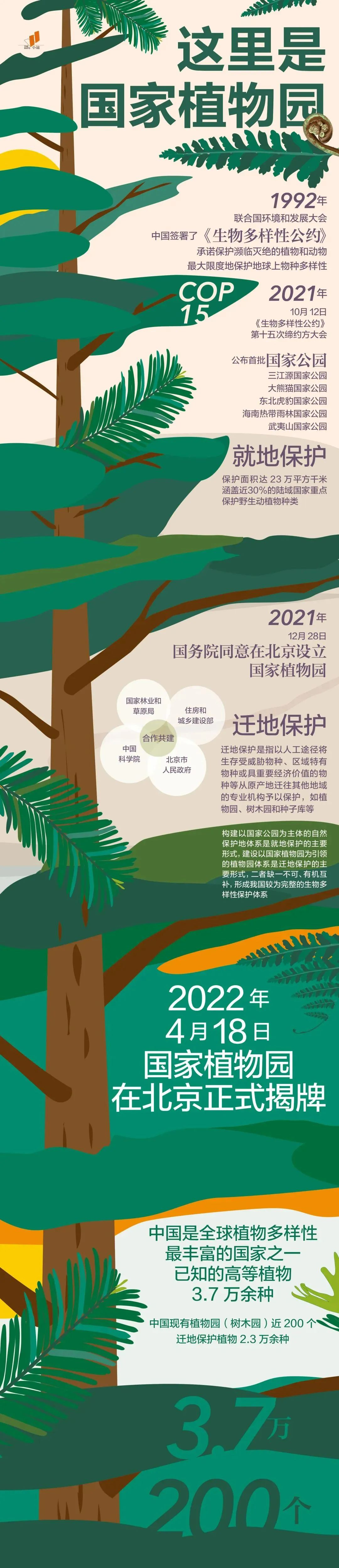 国家植物园是在中国科学院植物研究所(南园)和北京市植物园(北园)现有条件的基础上,经过扩容增效有机整合而成,总规划面积近600公顷。将同上百个国家的植物园和专业机构建立合作关系,打造国际一流的国家植物迁地保护中心、科学研究和交流中心、战略资源储备中心和科学传播中心。