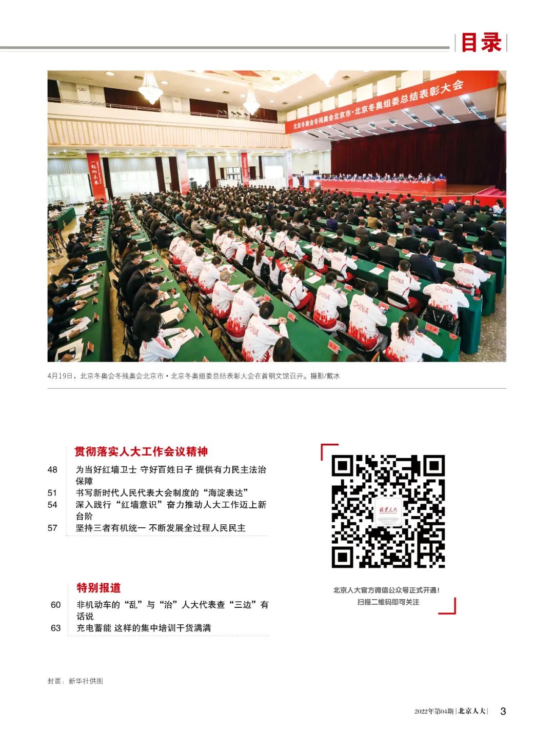 在市委领导下,全市各级人大、人大代表、人大工作者履职尽责、夙夜奉公,为冬奥成功举办贡献人大力量。在4月召开的北京冬奥会、冬残奥会总结表彰大会上,“北京市人大常委会机关冬奥村保障专班”荣获“北京冬奥会、冬残奥会突出贡献集体”称号。申奥成功7年,市人大及其常委会出台冬奥立法14项、决定2项,打出立法监督组合拳,首次开展京津冀协同立法,为冬奥成功筹办贡献重要法治力量。《北京人大》第4期对冬奥村保障工作系统总结,并以“无与伦比的冬奥盛会 卓有成效的法治保障”回顾冬奥法治建设累累硕果。还图文报道了冬奥运动员走进人大机关,与机关干部共叙双奥荣光的点滴故事。