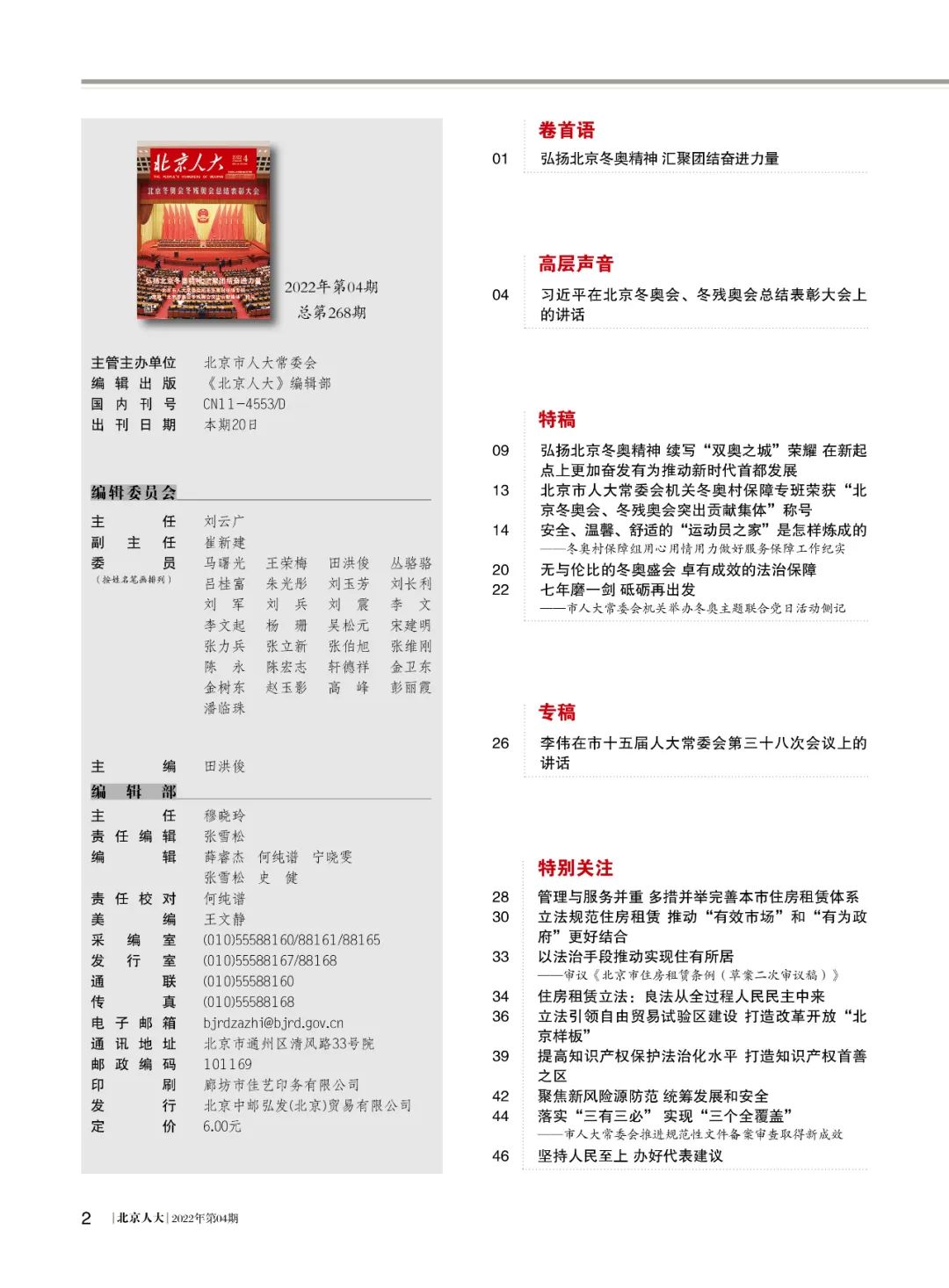 本期刊物还对市十五届人大常委会第三十八次会议的各项议题审议进行了深入报道,对各区人大贯彻中央人大工作会议精神情况进行了深入报道,充分展现全市各级人大、人大代表弘扬“胸怀大局、自信开放、迎难而上、追求卓越、共创未来”北京冬奥精神,以首善标准做好人大工作的新担当与新成效。
