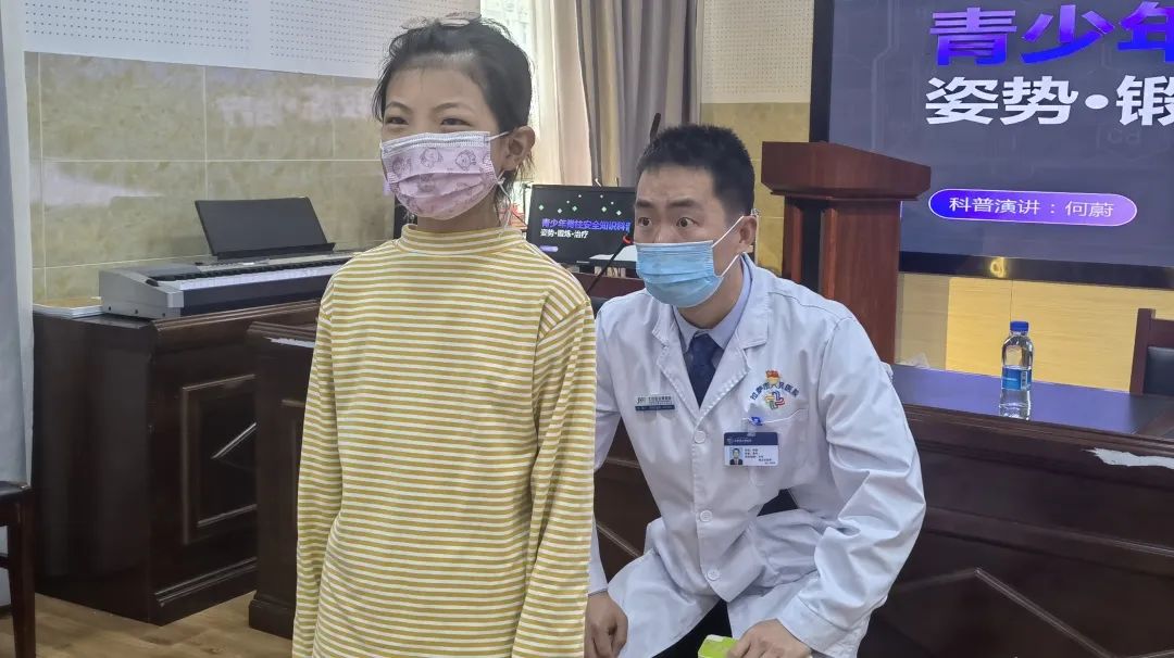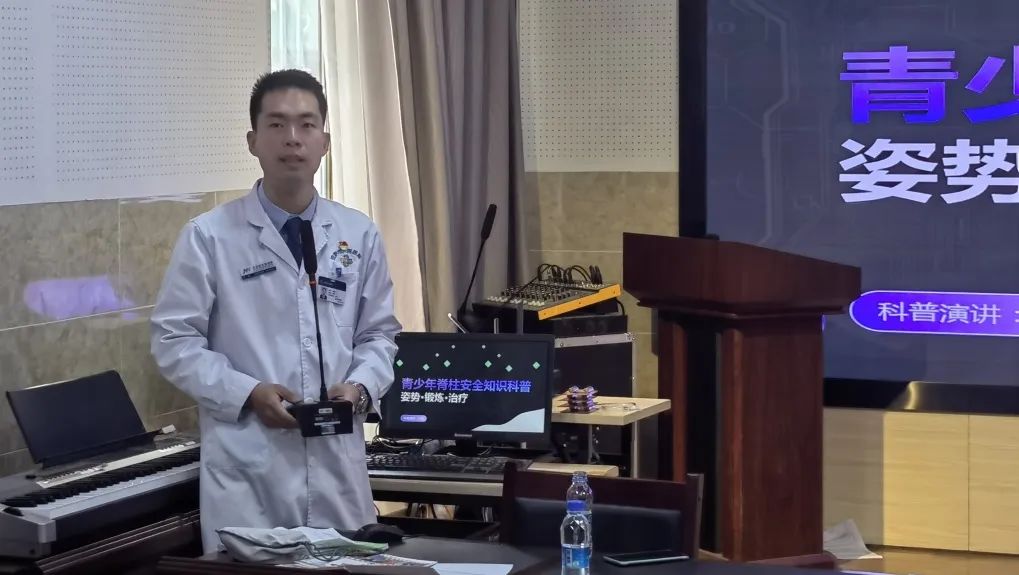 活动中,何蔚对同学们进行了青少年脊柱侧弯的健康科普,“什么是脊柱侧弯?预防措施又有哪些?”,何蔚用生动的例子深入浅出地讲解了脊柱侧弯的成因、危害与预防措施。