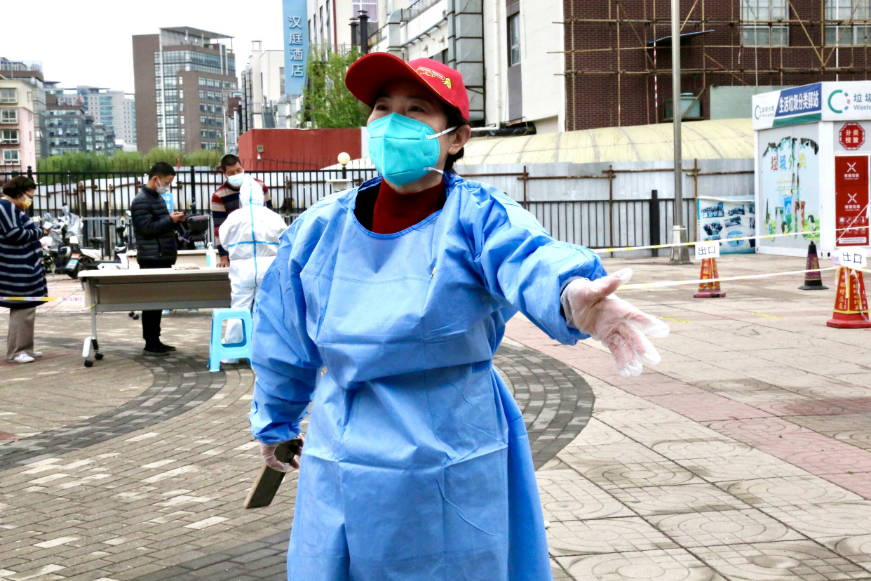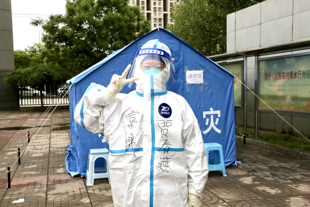 个头不高、身形娇小,近视镜片下一双笑眯眯的眼睛,96年出生的贾春燕是丰台区看丹街道富锦嘉园社区最年轻的小姑娘。4月28日一大清早,还在淅淅沥沥下着小雨,贾春燕已经把自己塞进厚厚的防护服,忙碌在所负责的核酸检测站点。“请把口罩规范佩戴好,千万别摘下来啊”“别靠太近别着急,大家保持距离”“阿姨没带身份证也别着急,您把身份证告诉我输入进去就好啦”……
