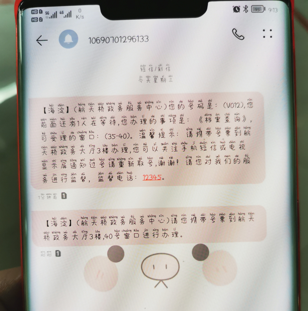 记者在现场看到,“无声叫号”模式开启后,虽然没有了广播提示,但是等候大厅的叫号显示屏依旧会进行提示,客户可以通过屏幕的信息确定当前的排队进程。每个办事窗口上方的LED显示屏,也会对当下进行业务办理的群众号码进行提示。为了避免办事群众错过排队信息,区不动产登记事务中心还贴心地为办事群众增加了短信提醒功能。即使办事群众没有注意到屏幕的提示,手机的短信通知也会进行排队提醒。