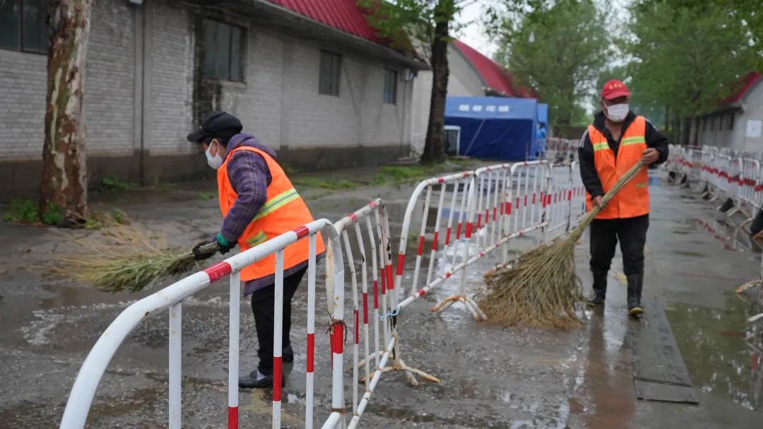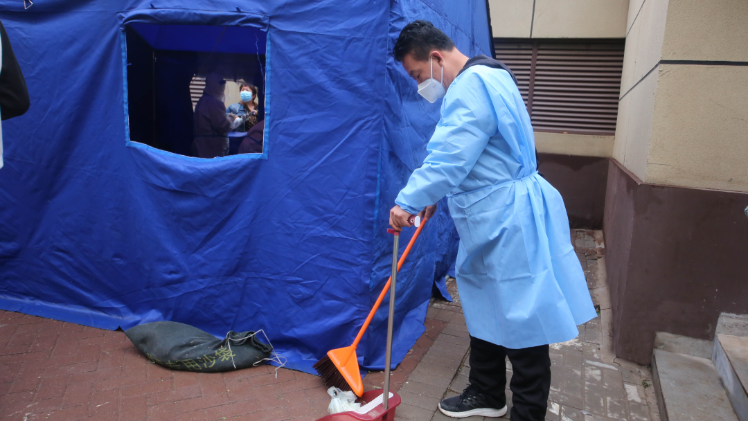 防疫要遵守,身边有文明。为时刻保持现场环境整洁,他们手拿扫把及时清理地面积水与白色垃圾,并积极引导群众核酸检测。