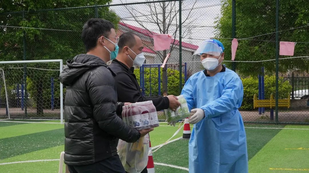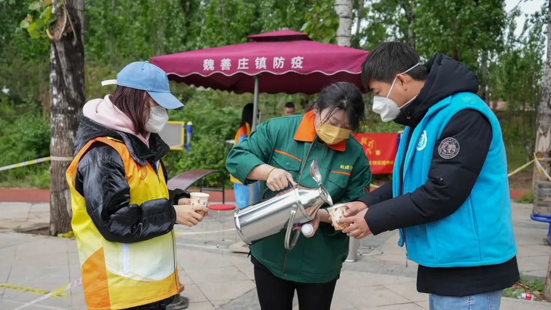 “来,喝杯红糖水暖暖身子。”魏庄村企业为现场工作人员、志愿者送上红糖水,东枣林村民还为防疫工作者送来零食和饮料。