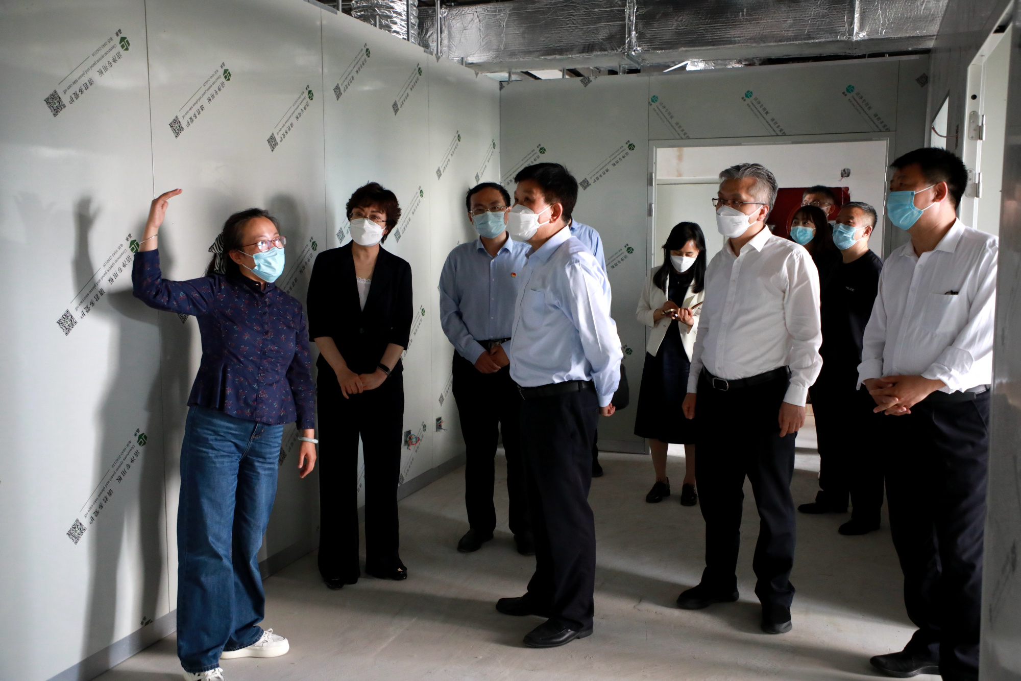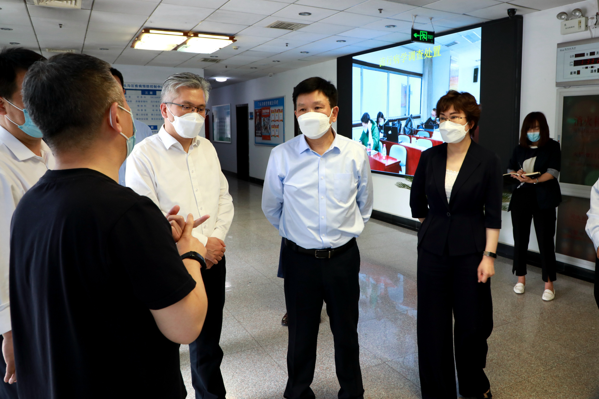莫高义到区疾控中心听取关于人员流调、风险点位排查等方面的工作汇报,询问当前疫情防控中人员配备、流调、转运工作运转情况,了解实验室建设进展。