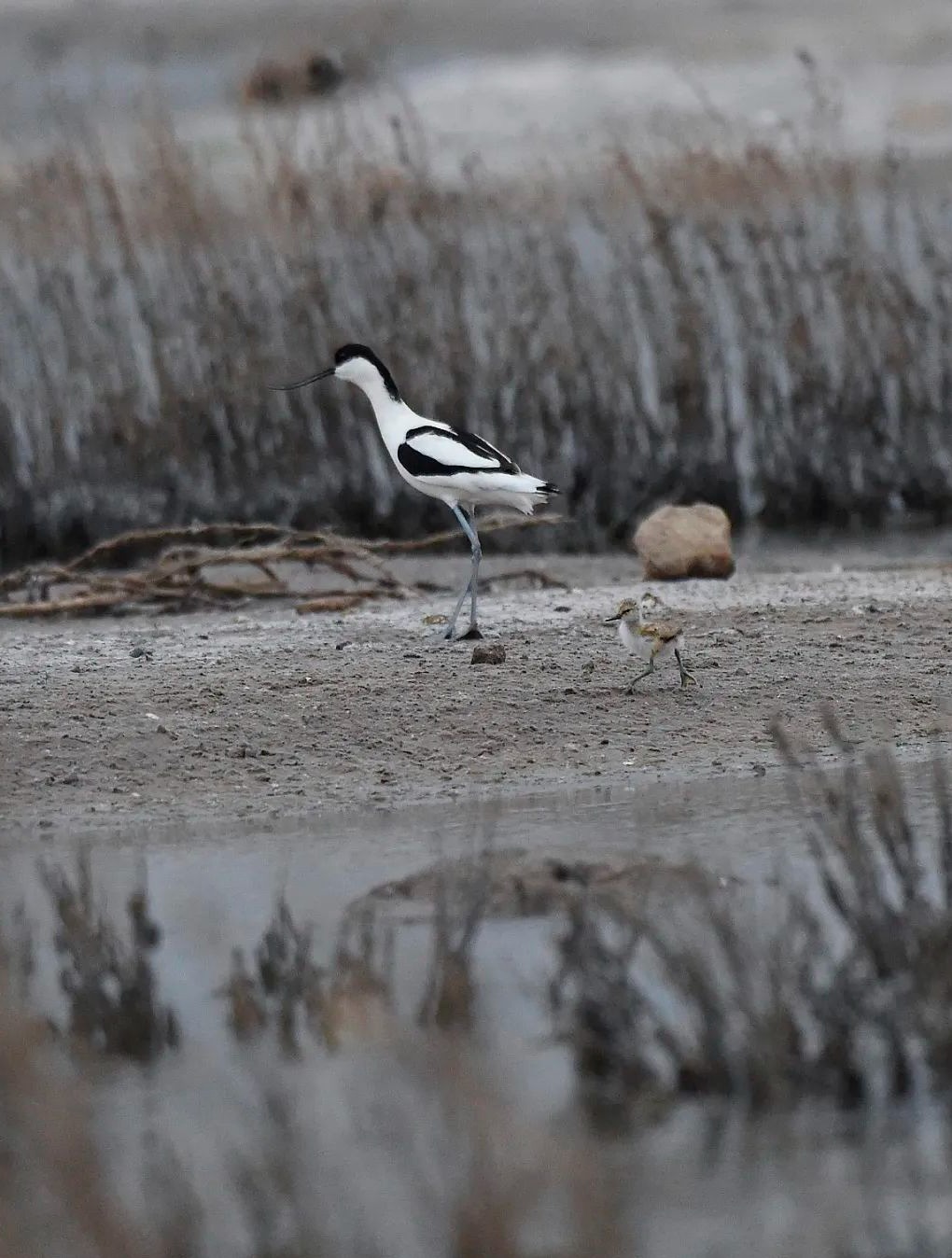 反嘴鹬宝宝一身毛茸茸的羽毛,大大的脚,十分的可爱。它紧跟着妈妈在水塘的周围走,反嘴鹬妈妈每走一会儿,都会回头等待走得很慢的反嘴鹬宝宝。现场画面十分温馨。