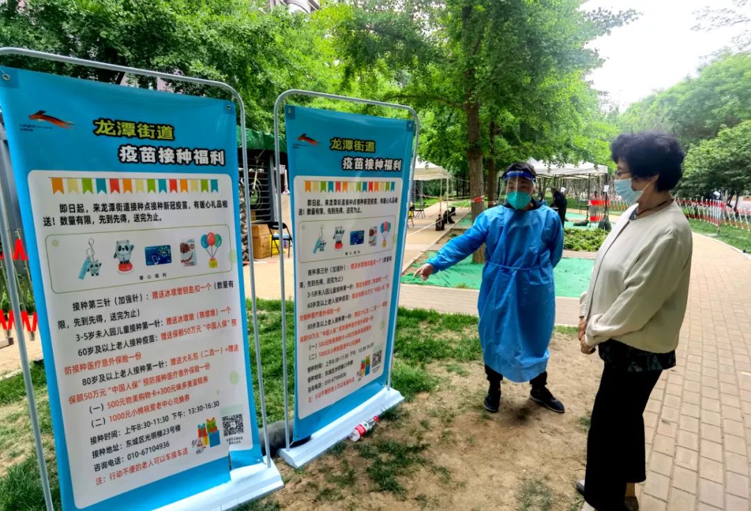 东华门街道、交道口街道则把疫苗接种的相关信息和知识点印在了宣传折页和海报上,在辖区核酸检测点进行发放和展示,为宣传动员工作助力。