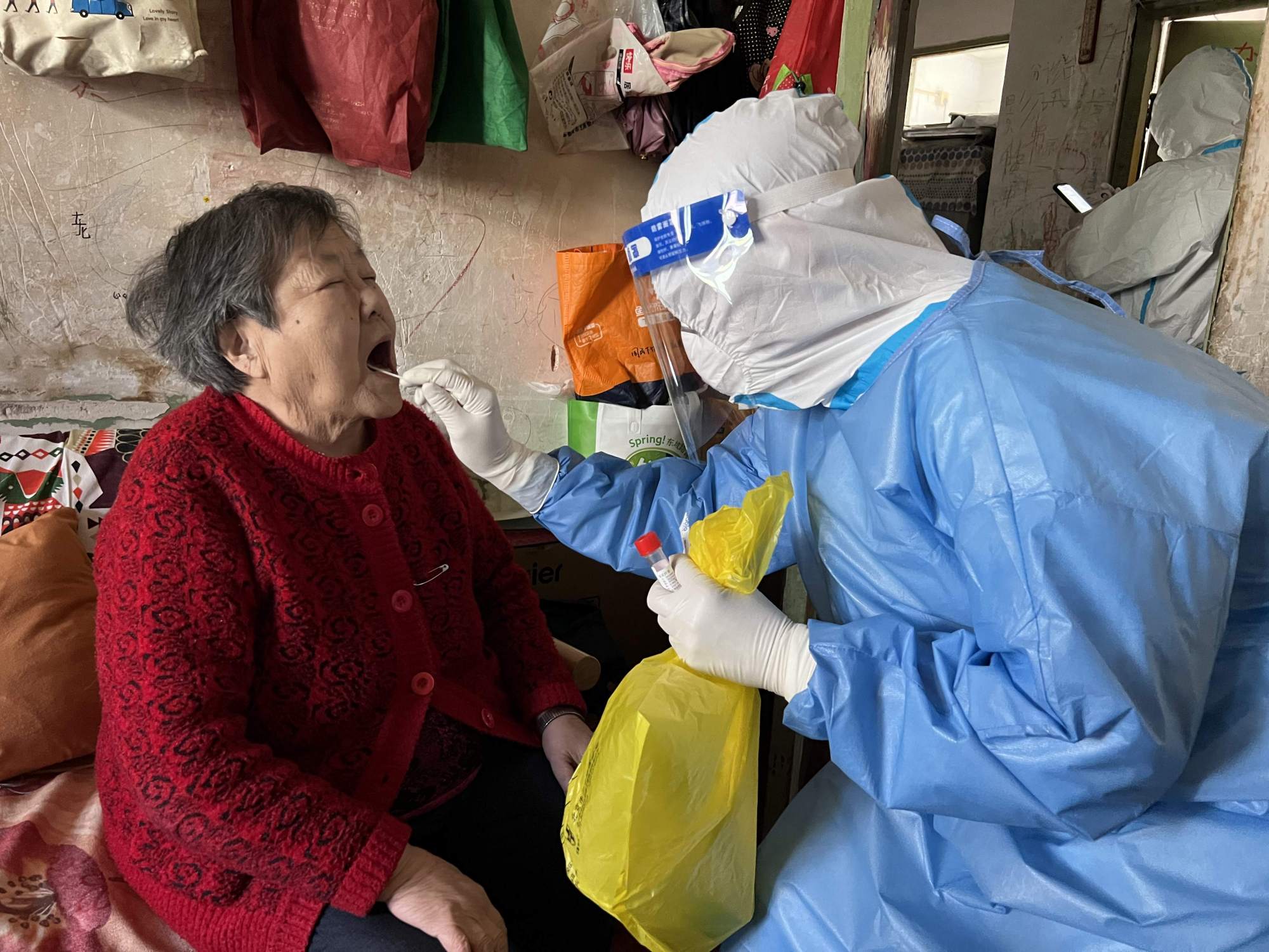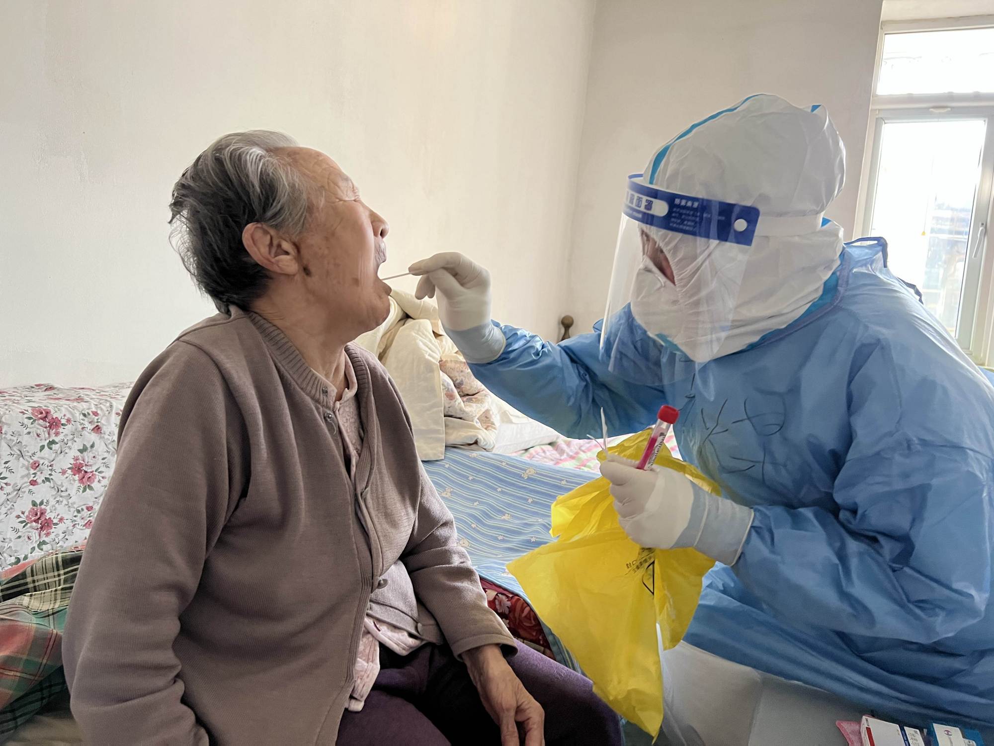 “您好,我们是上门来为您做核酸采样的。”早上8点钟,医务人员敲开80岁高龄张奶奶的家门,亲切地向她解释来意,并为她进行扫码测温、信息登记和核酸采样等相关操作。