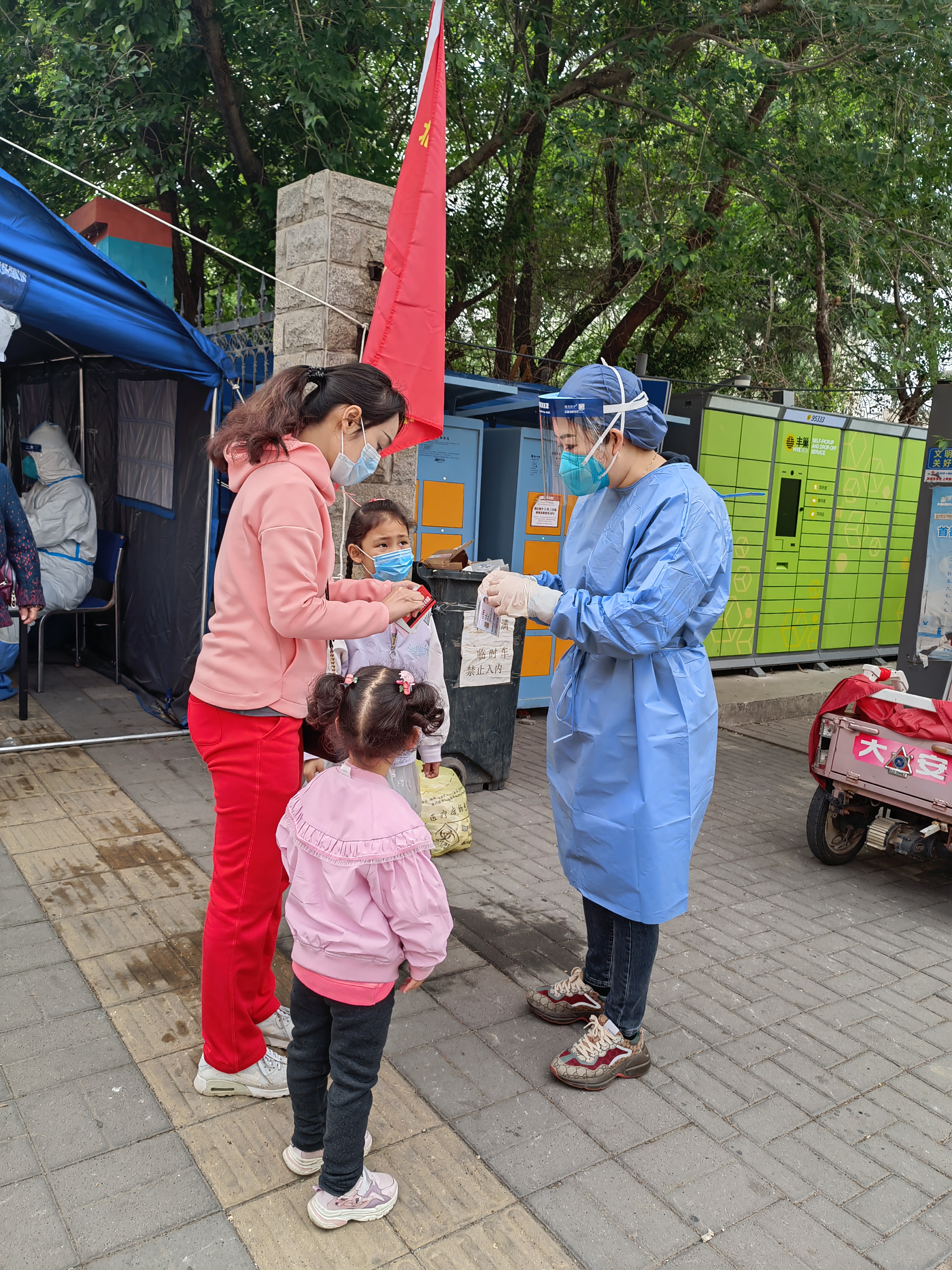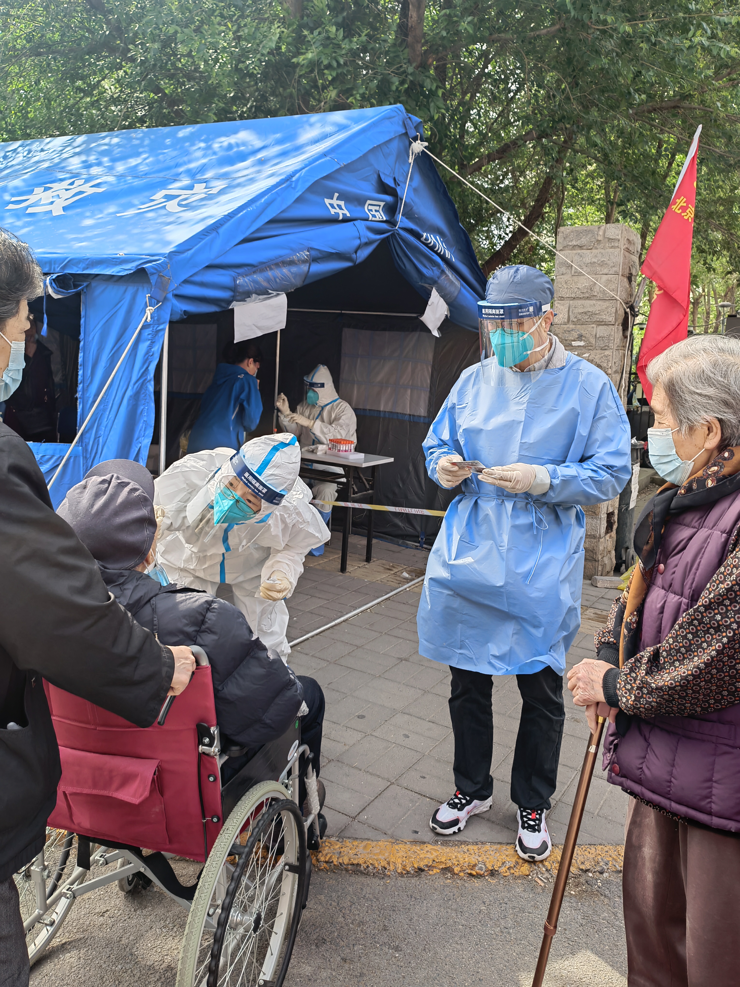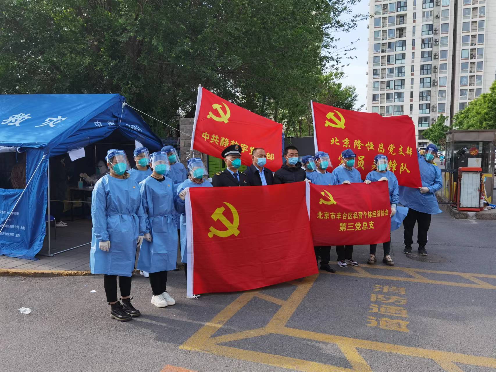 5月11日,丰台区私个协第三党总支书记、青塔街道市场监督管理所负责人王庆涛,带领2位党支部书记和十余名党员再次来到青塔西里社区核酸检测点开展志愿服务活动。
