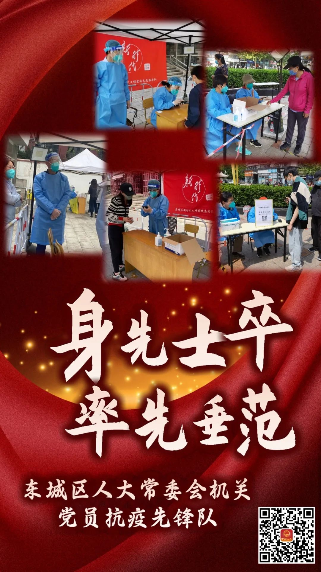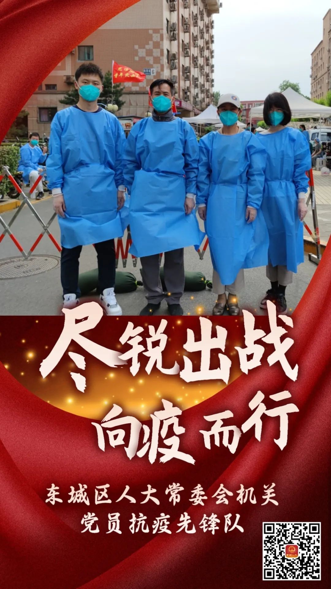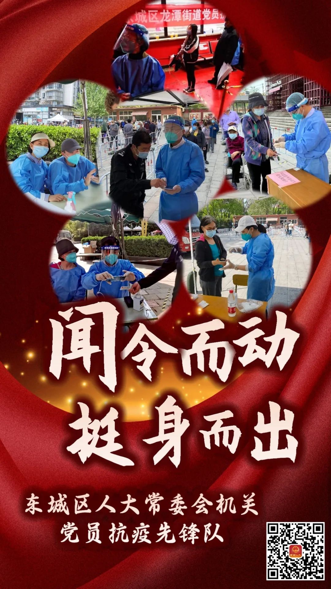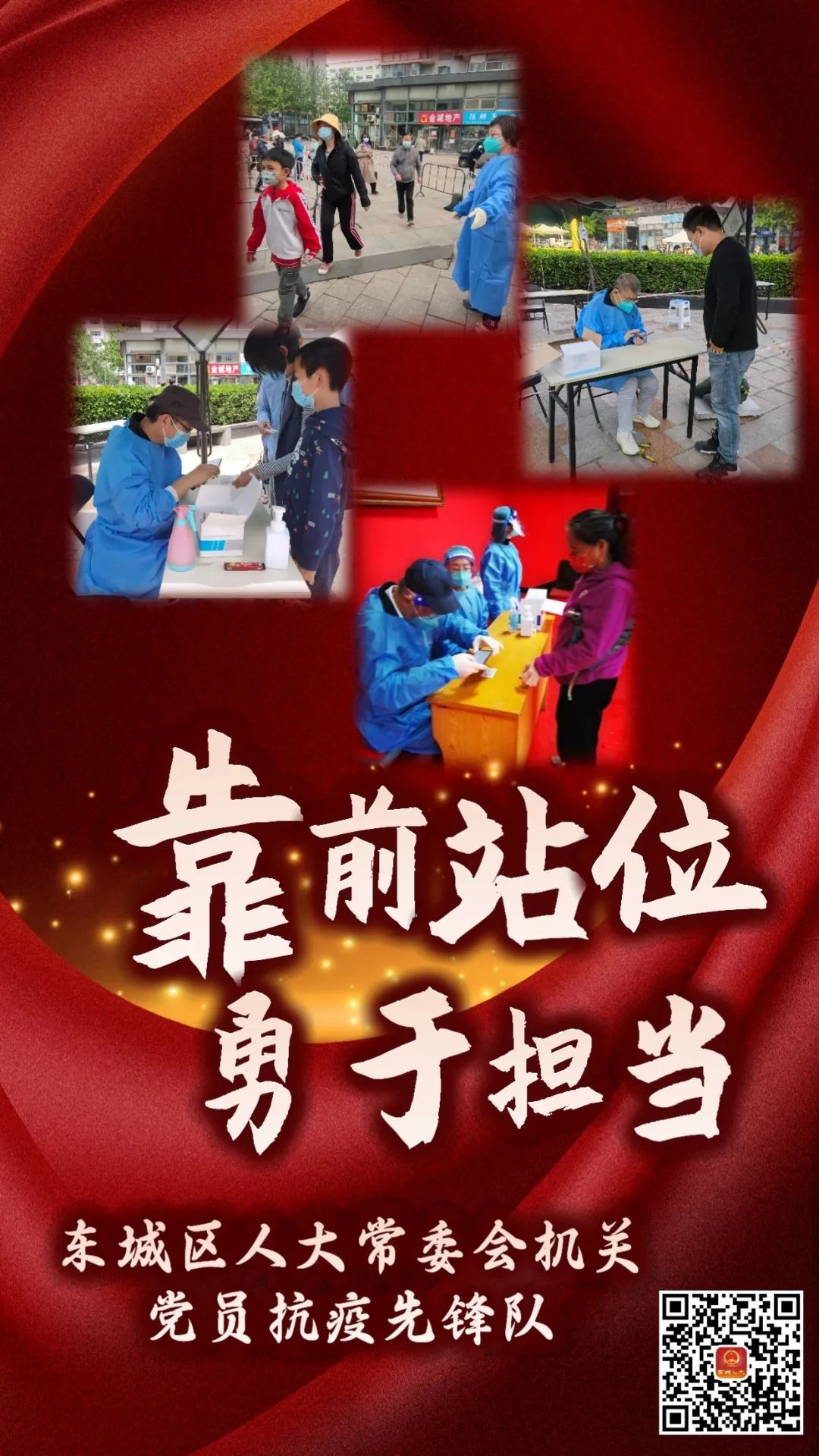 在当前全市抗击新冠肺炎疫情的紧要关头,东城区人大常委会机关广大党员干部坚决响应党中央和市委、区委号召,在区人大常委会党组的领导下,闻令而行,尽锐出战,积极支援基层抗疫一线,全力以赴保障区域核酸检测人员力量;机关党员抗疫先锋队火速集结,冲锋在前,在大战中践行初心使命,于大考中书写奉献担当,真正做到“平常时候看得出来、关键时刻站得出来、危难关头豁得出来”,让党旗在疫情防控一线高高飘扬。