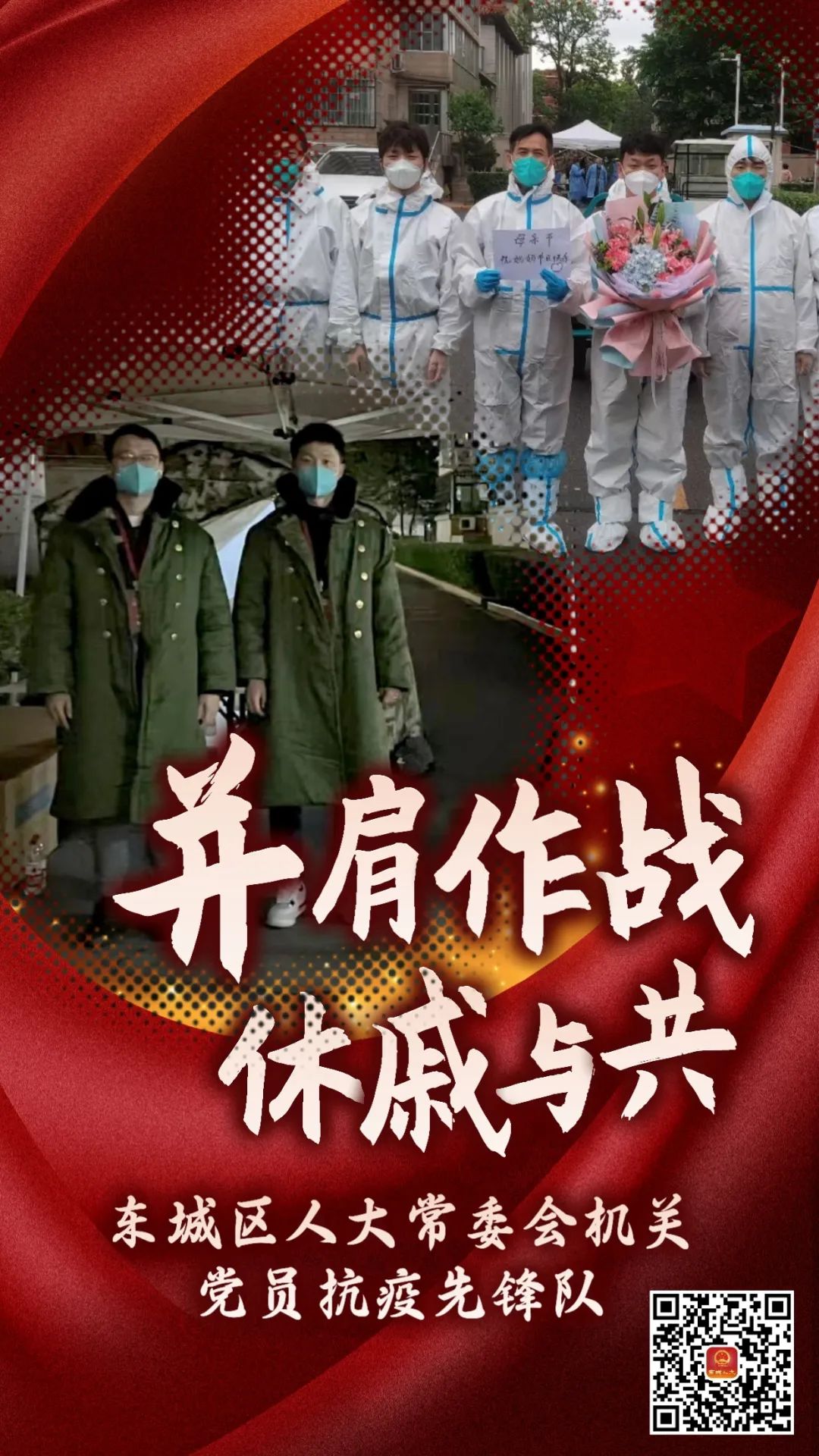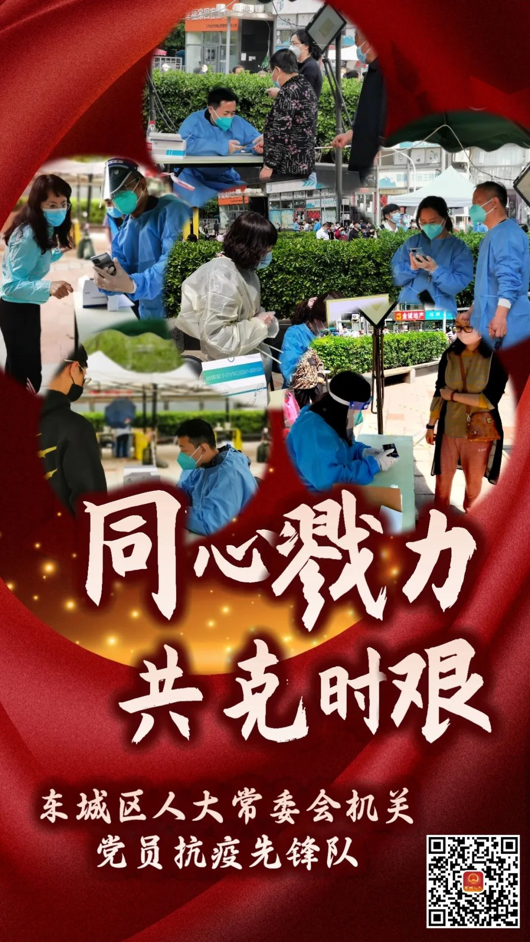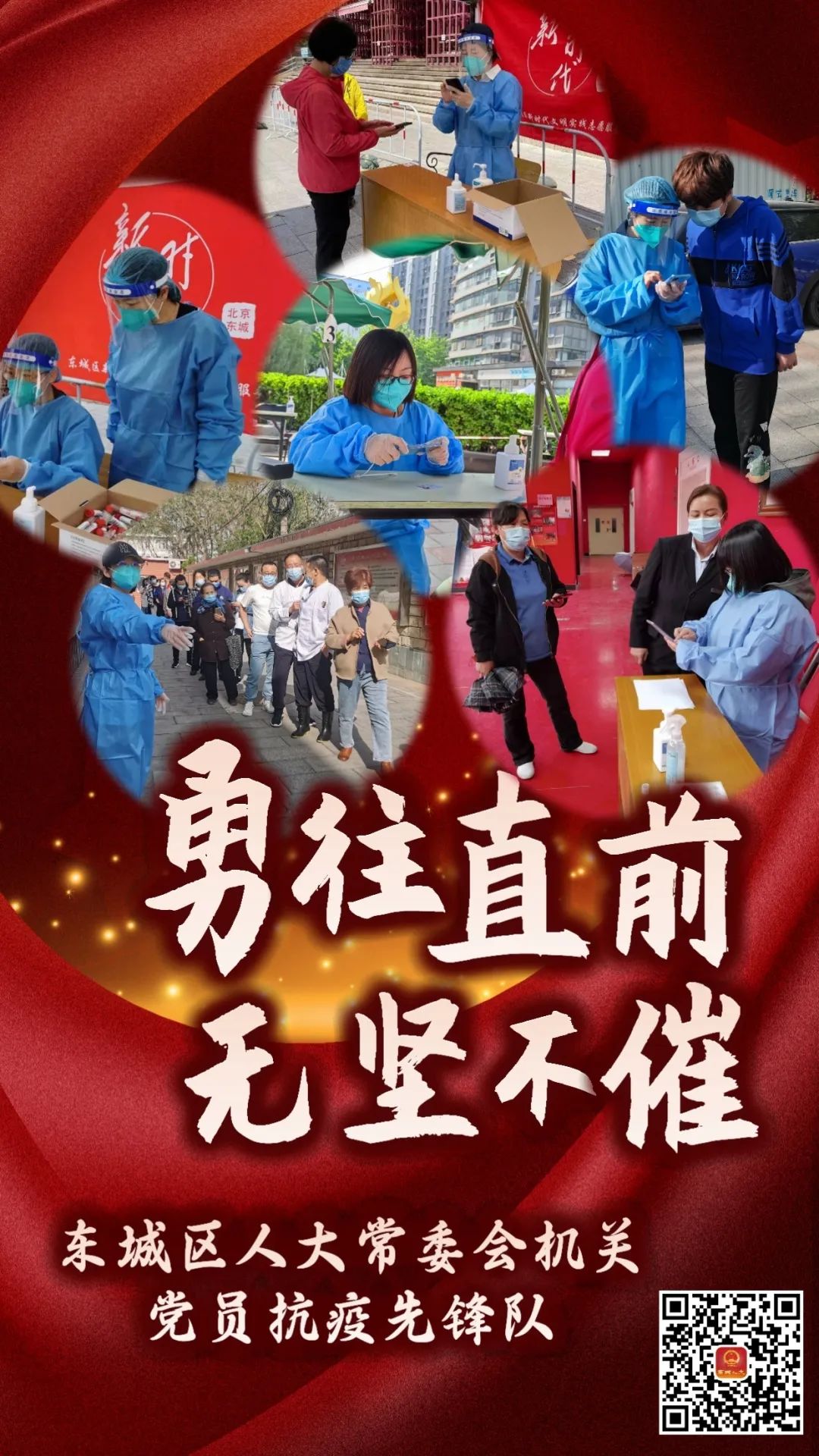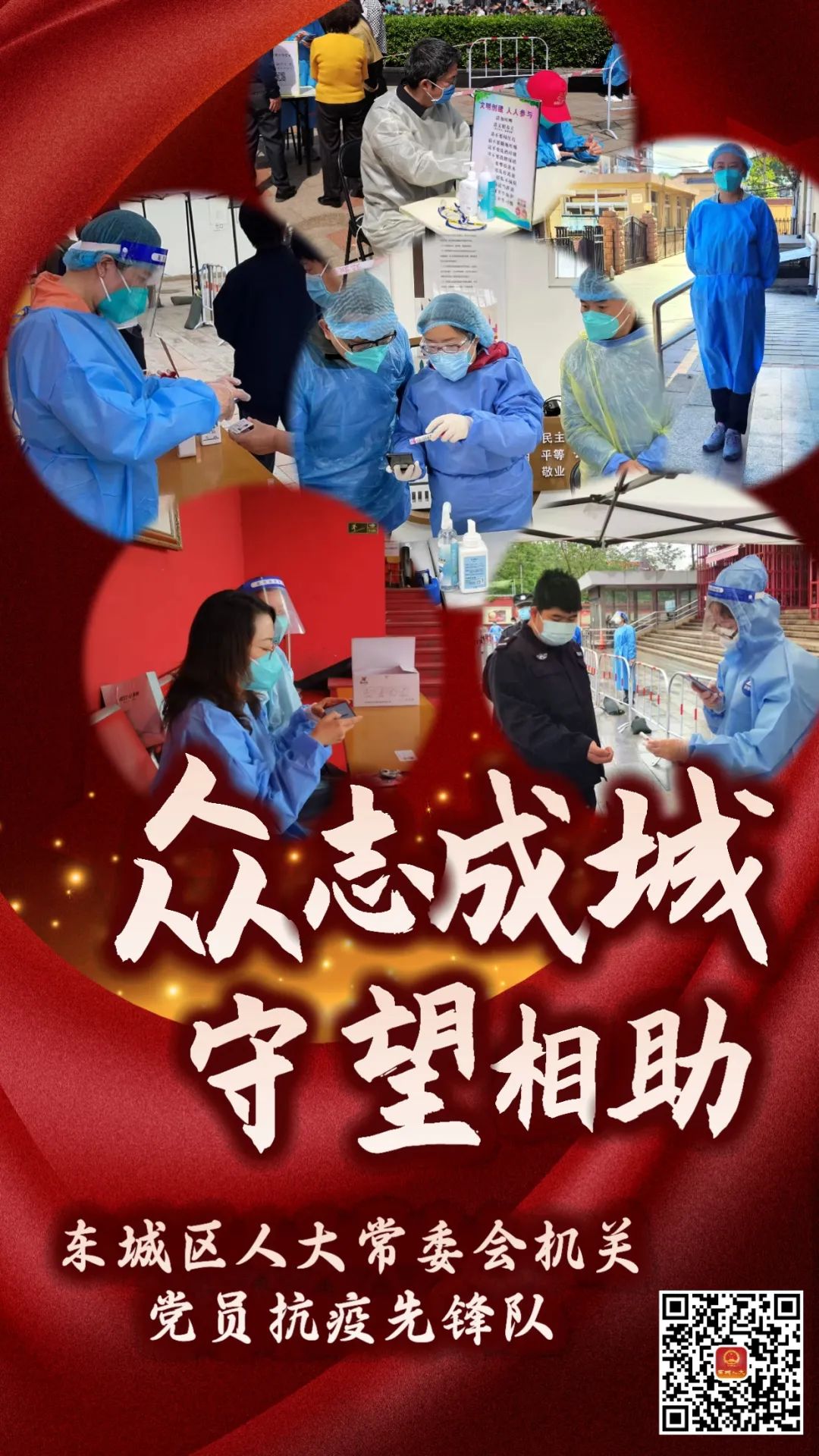 在当前全市抗击新冠肺炎疫情的紧要关头,东城区人大常委会机关广大党员干部坚决响应党中央和市委、区委号召,在区人大常委会党组的领导下,闻令而行,尽锐出战,积极支援基层抗疫一线,全力以赴保障区域核酸检测人员力量;机关党员抗疫先锋队火速集结,冲锋在前,在大战中践行初心使命,于大考中书写奉献担当,真正做到“平常时候看得出来、关键时刻站得出来、危难关头豁得出来”,让党旗在疫情防控一线高高飘扬。