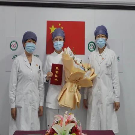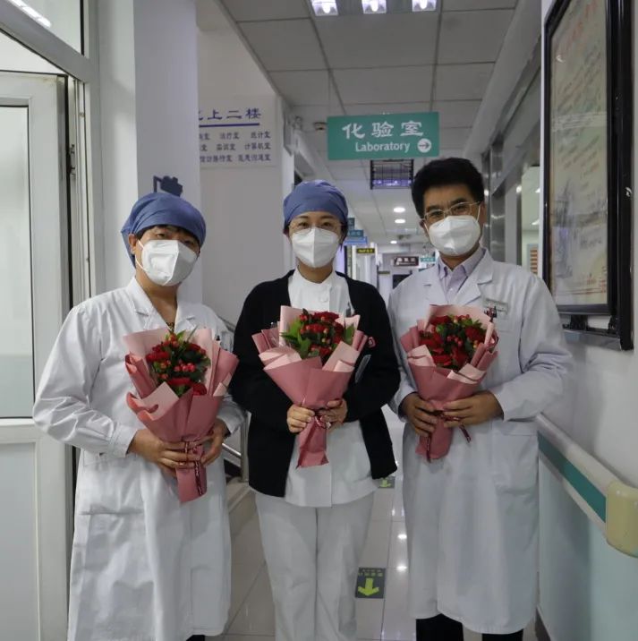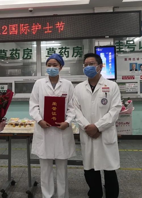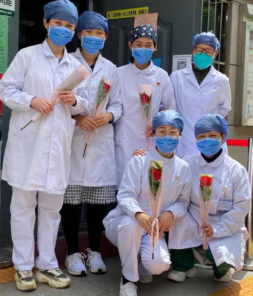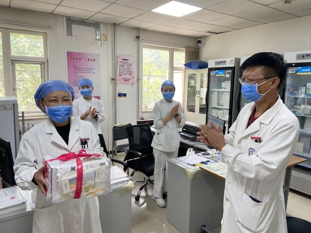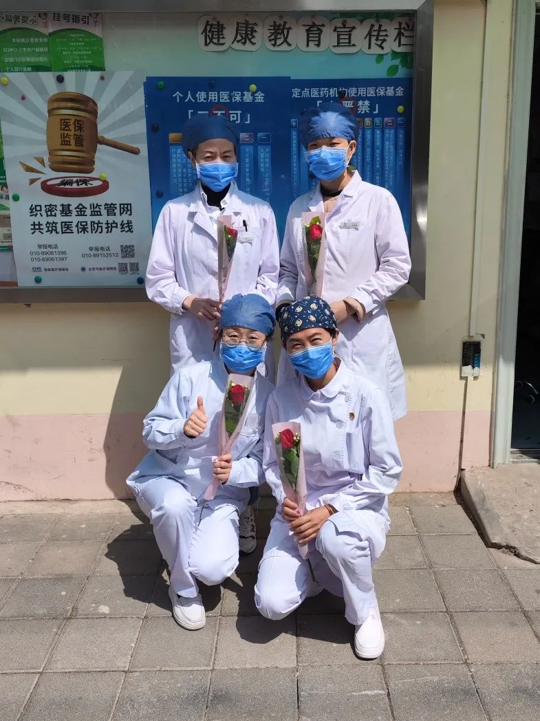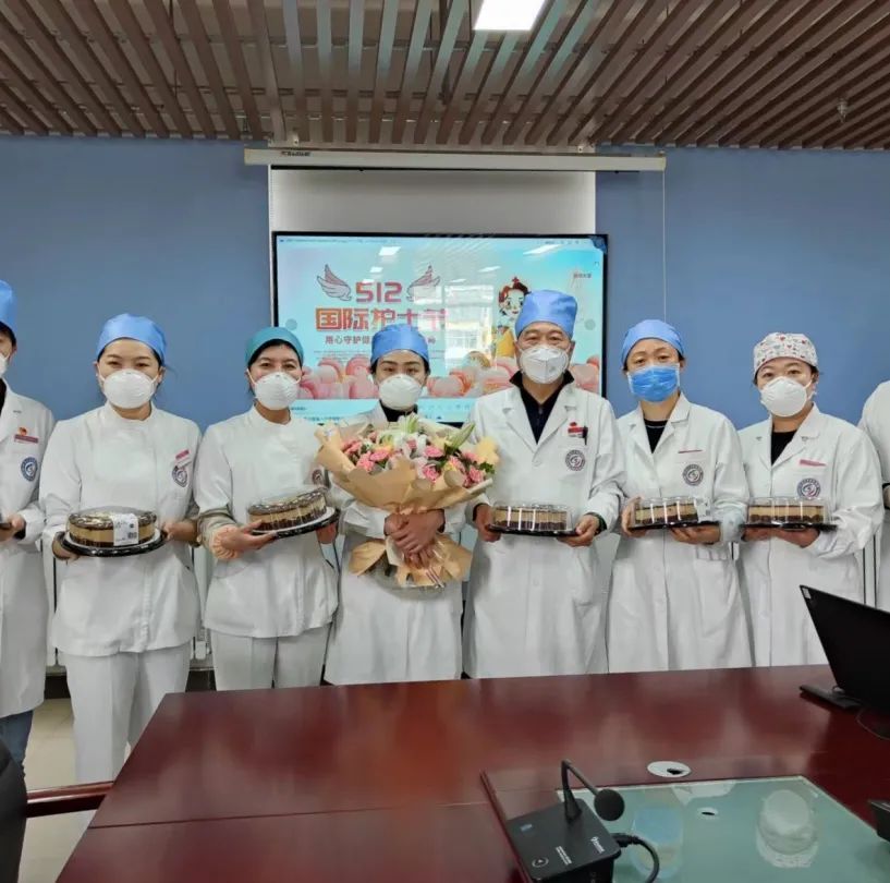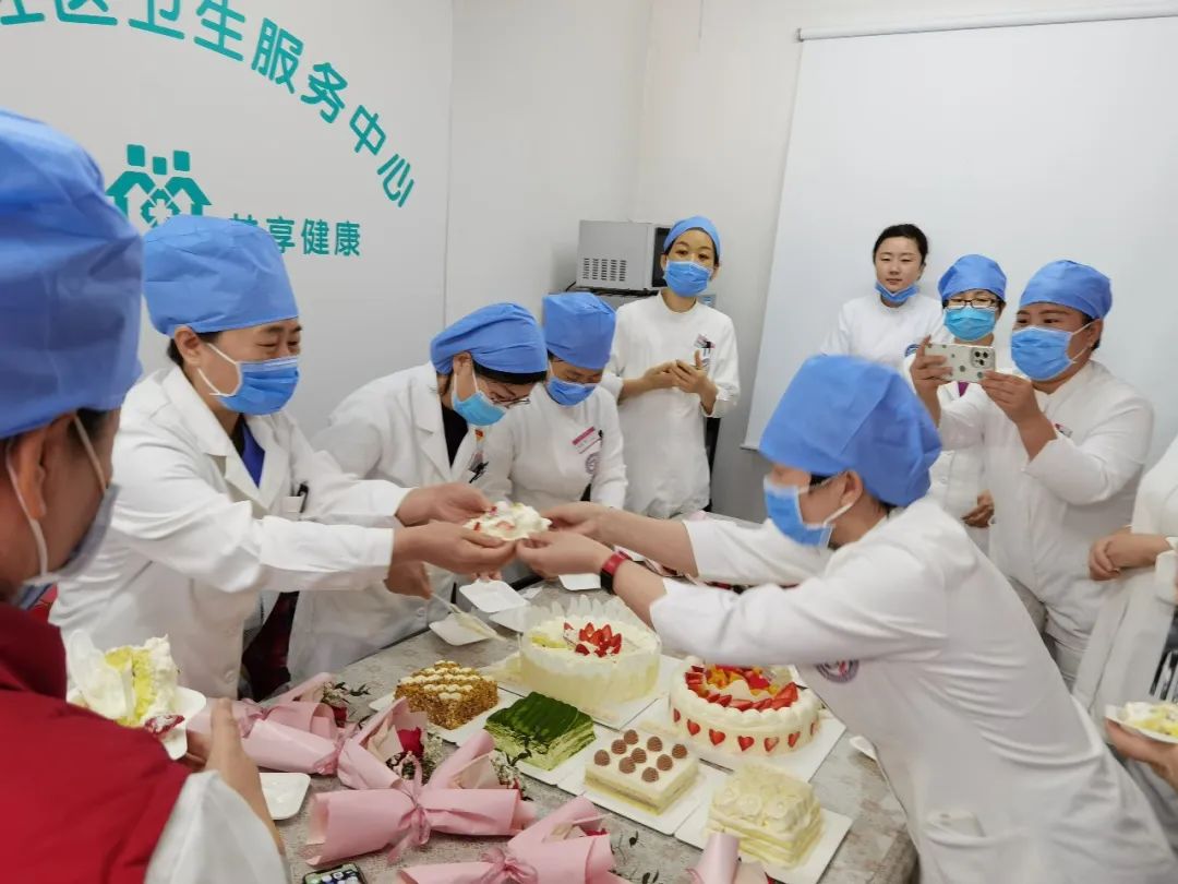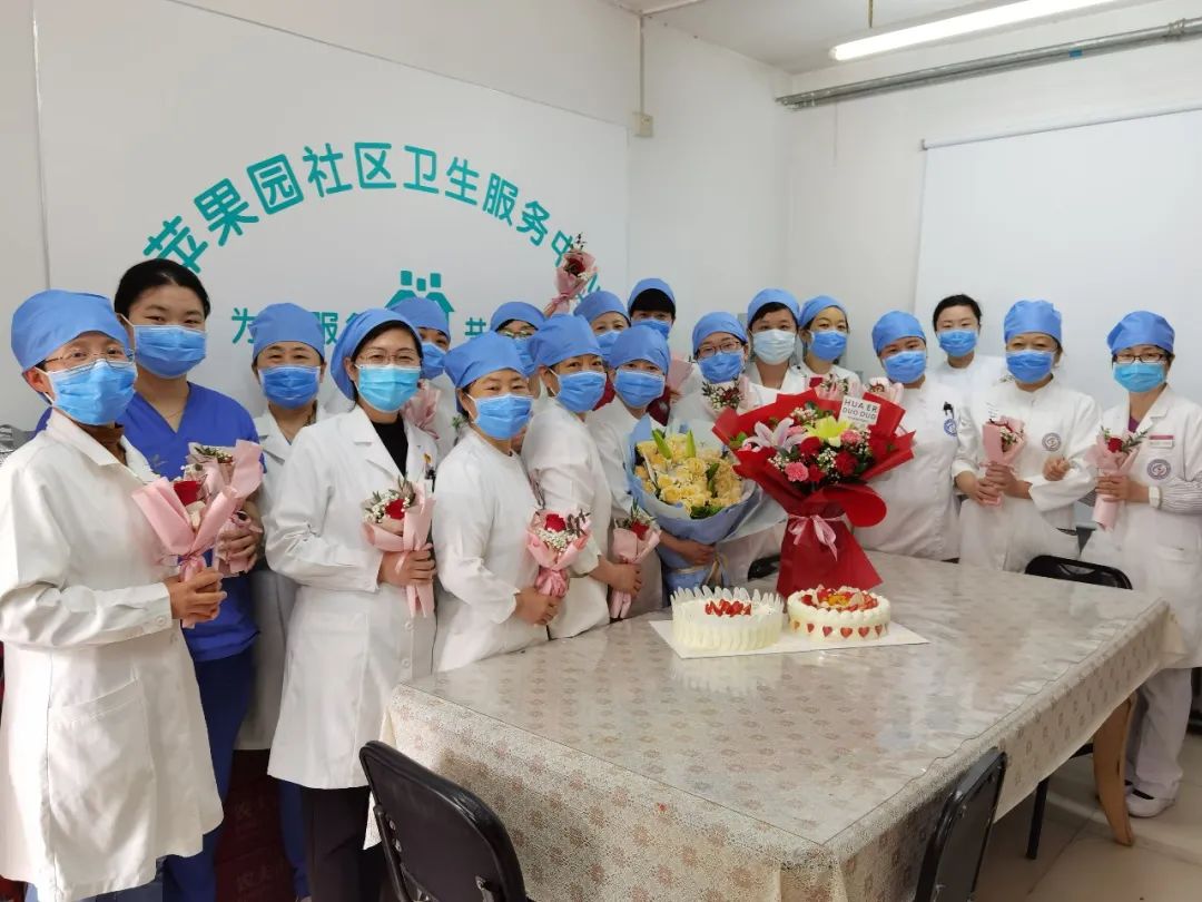 苹果园社区卫生服务中心为战役护士姐妹送上鲜花和蛋糕。