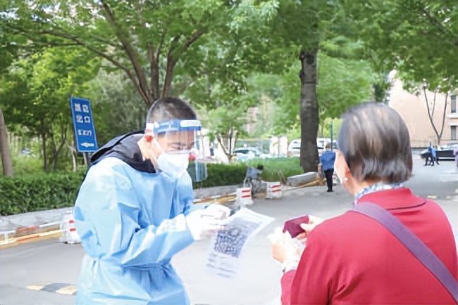 受到鼓舞的贾鑫蕊穿上防护服,变身志愿者,在社区防疫点为社区居民扫码,用实际行动肩负起青年人的使命与责任,在抗疫一线贡献着青年党员的力量。