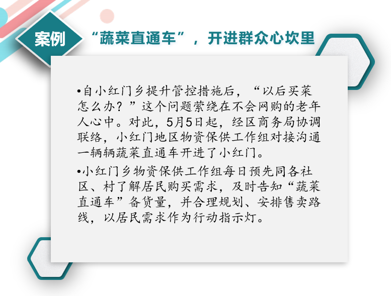 直通车+储运点,协调蔬菜直通车进社区,设置蔬菜就近储运点位,搭建快递货架到到楼门。