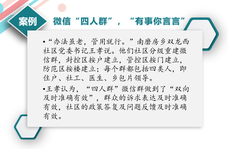 “0”误差,发布信息。临时管控的各项要求、核酸检测以及其它服务保障措施,第一时间通过居民微信群及时向群众传达,同时在小区门口、单元门等位置张贴。畅通群众举报热线,各社区24小时热线电话畅通,做好居民疫情防控诉求处置,吸附12345案件量。