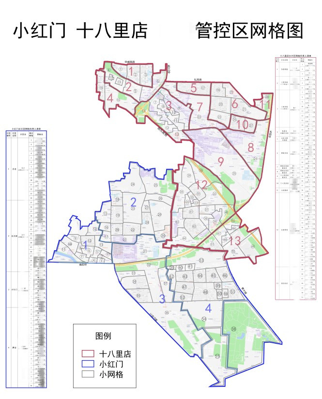 由十八里店、小红门、南磨房三个乡结合辖区人口分布、地域地形,根据“片区+网格+点位”的模式,建立网格化管理机制和工作流程,同时制作社区(村)“作战地图”,清晰标记出入口、楼栋人口数、医疗结构、垃圾站点等必要信息,确保防控工作横向到栋、纵向到户、靶向到人。
