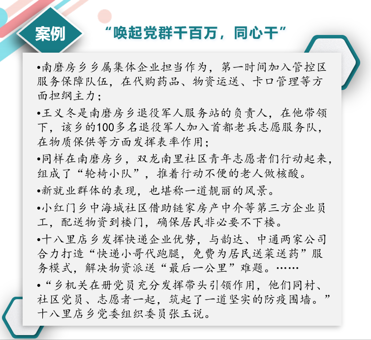 在此过程中,农村地区还延续“一方有难、八方支援”的互助模式。其中,7乡2农口单位,派出289人,支援十八里店乡;7乡1农口单位,派出270人,支援小红门乡。他们与属地人员一道,奋战在核酸检测、电话排查、物质配送、小区巡查、出入口管控等一线。