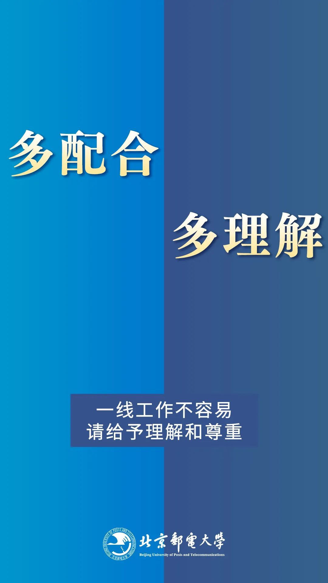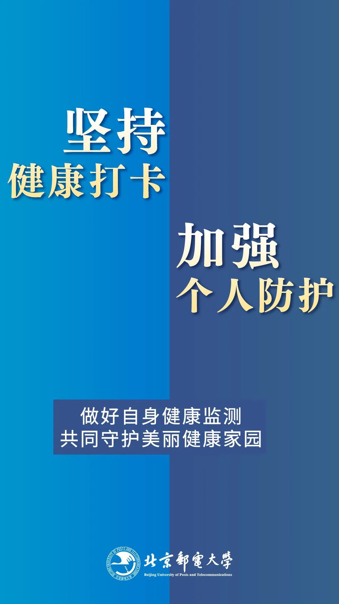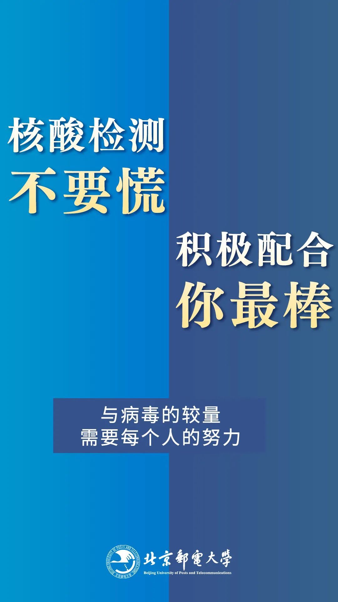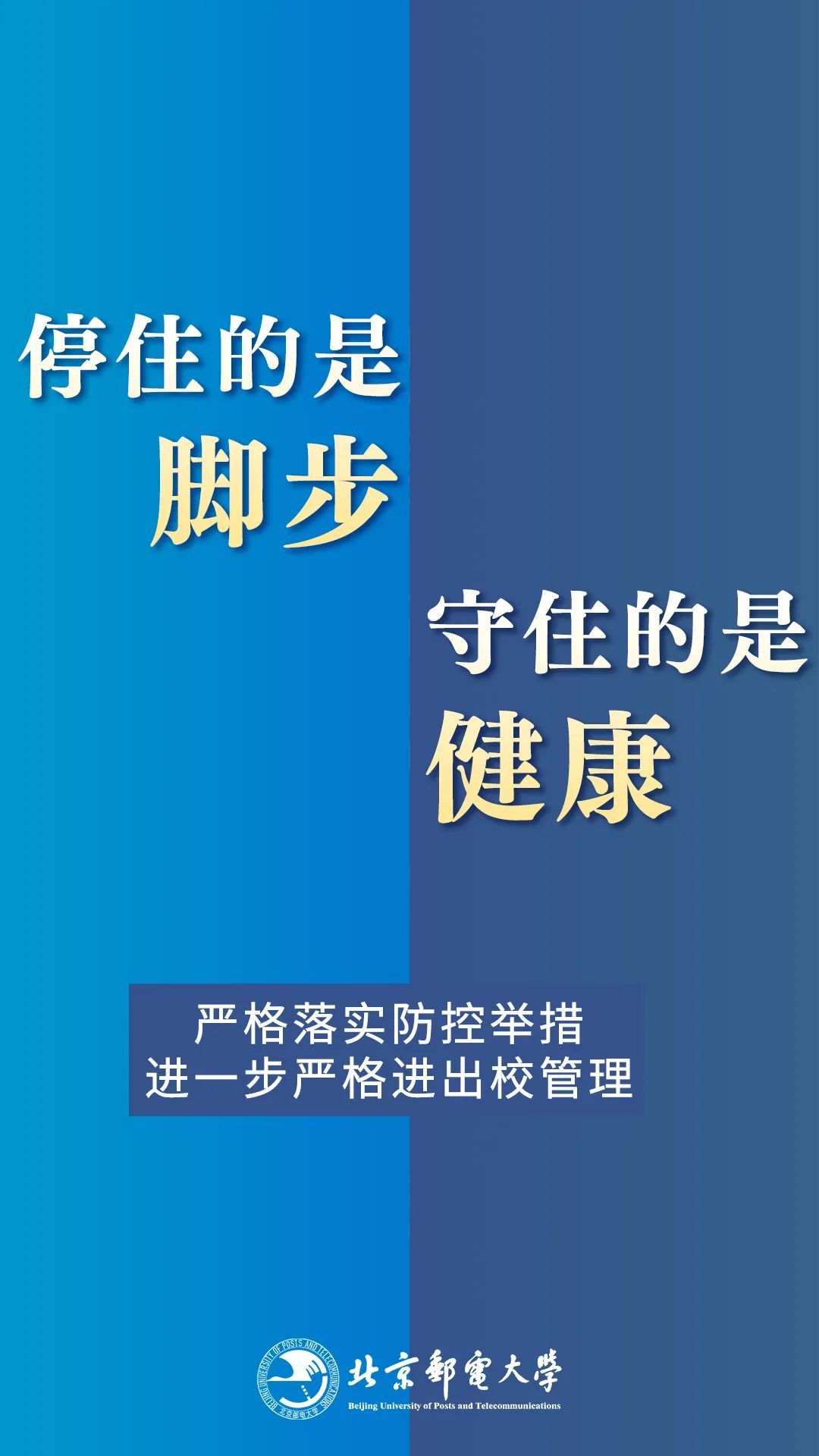 为进一步做好校园疫情防控工作,学校根据最新防控形势,快速反应,制定了一系列相关措施,严格出入校管理、取消堂食分散就餐、体育馆暂停开放,也许这些措施让你感到不便,然而,社会面隐匿传染源依然存在的当下,你的每一次止步,都是为了保护自己也是为了守护他人;首都疫情处于胶着状态的今天,你的每一份付出,都是阻止病毒反扑的重拳!