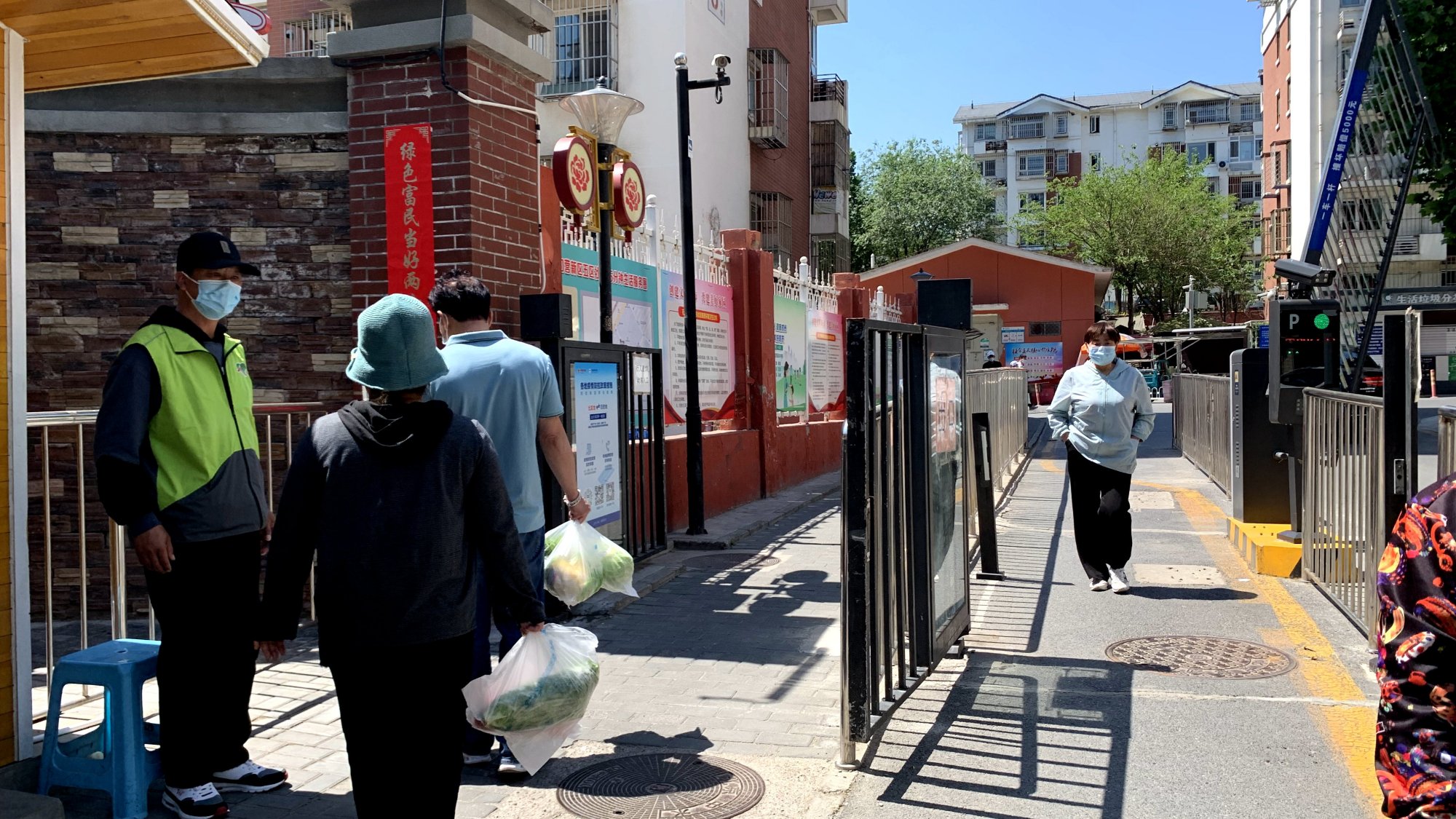 记者在东辛房街道石门营五区社区门前看到,社区志愿者已经按照要求到岗到位,引导居民、快递、外卖人员扫码测温,指挥行人出入分离,保障社区秩序。