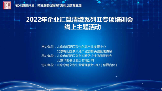 此次活动是国家文创实验区“优化营商环境 精准服务促发展”系列活动第三期,由北京市朝阳区文化创意产业发展中心、国家文化产业创新实验区管委会主办,北京市朝阳区文创实验区企业信用促进会、国家文化产业创新实验区文化金融服务中心承办。