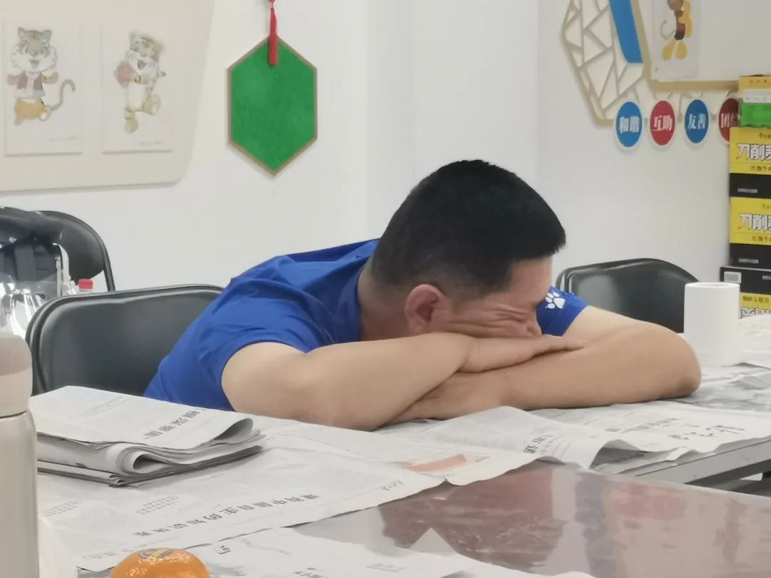 我之前在康营家园15区临时封闭区负责生活物资配送、核酸检测信息登记等工作,现在在南磨房主要负责设备维护和后勤物资保障。经常连续工作很长时间,实在是太累了,只能趴在桌子上休息片刻,任务来了就得马上起身再赴“战场”。——金沛书