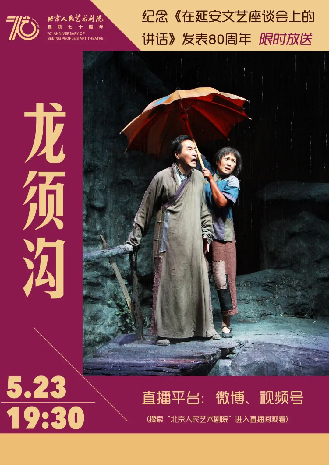 5月23日晚19:30,北京人艺还将通过北京人民艺术剧院官方视频号、官方微博等平台,限时放送剧院经典现实主义剧作《龙须沟》的戏剧影像。