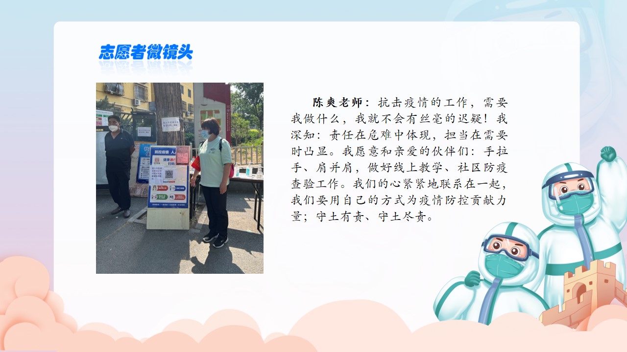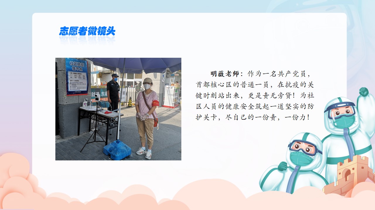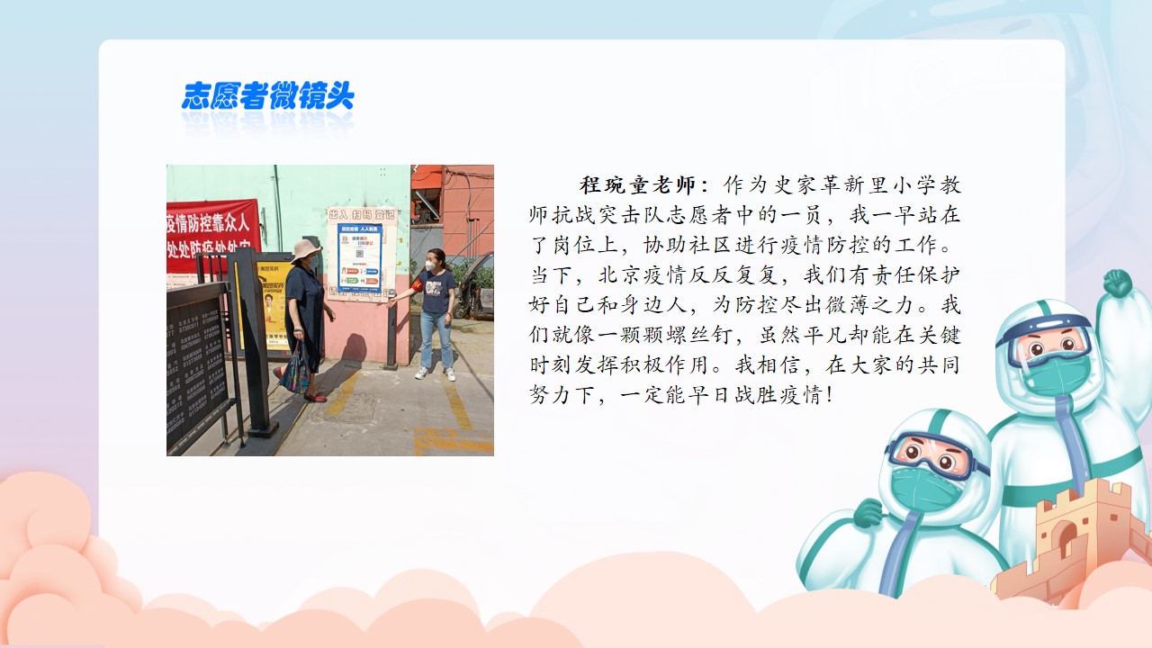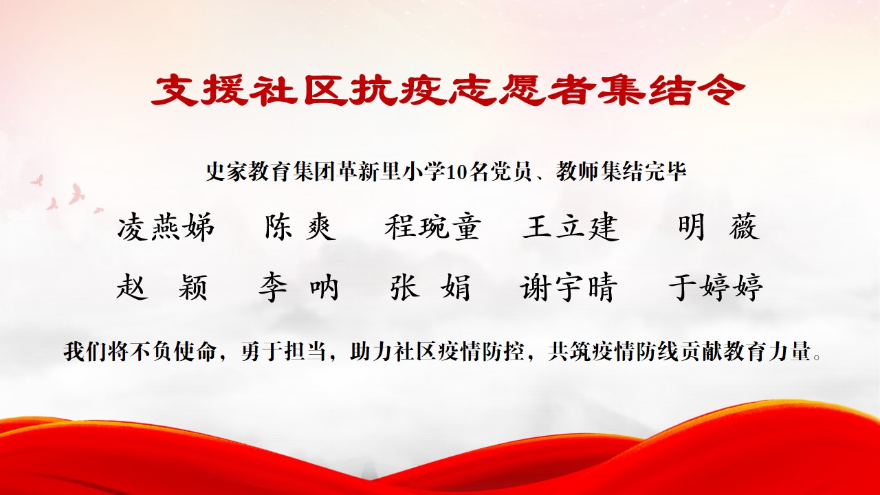 当前北京疫情防控正处于关键阶段,为坚决打赢疫情防控阻击战,坚持“动态清零”不动摇,进一步从严从紧抓好疫情防控工作,史家教育集团革新里小学全体党员、教师响应东城区教委的号召,积极“下沉”社区,率先示范,勇于担当,开展志愿服务,扛起“守家”“护家”的责任,助力社区疫情防控。