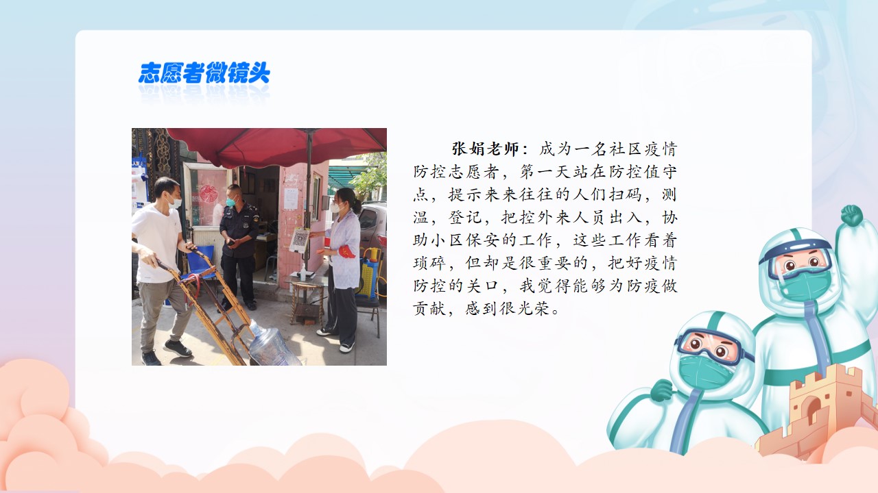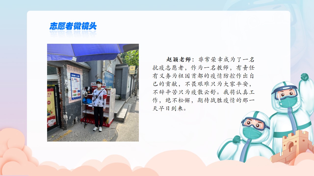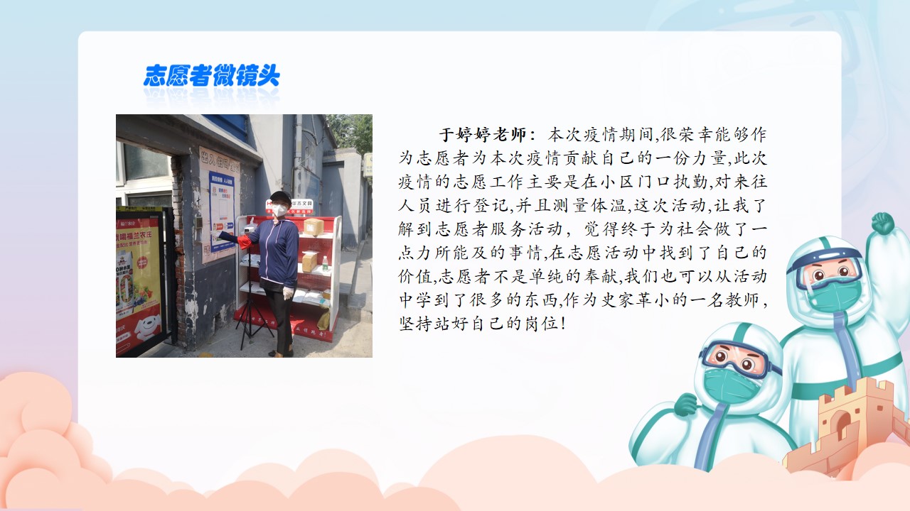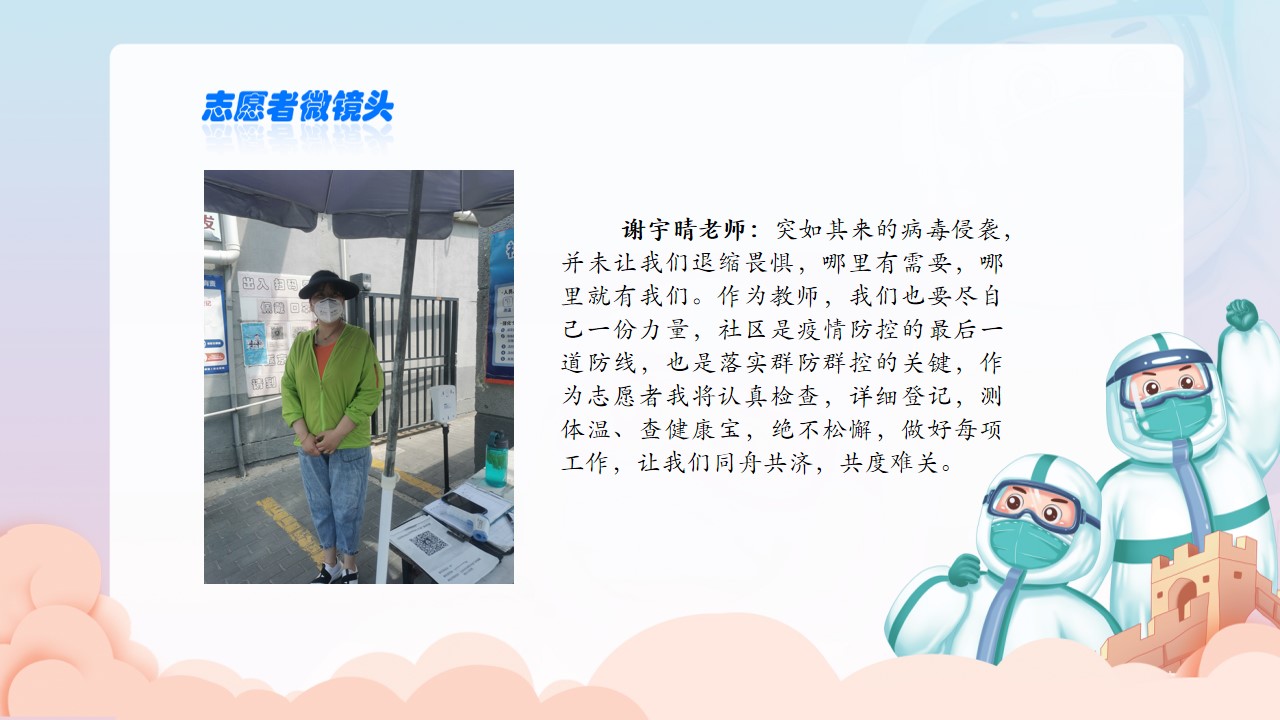 当前北京疫情防控正处于关键阶段,为坚决打赢疫情防控阻击战,坚持“动态清零”不动摇,进一步从严从紧抓好疫情防控工作,史家教育集团革新里小学全体党员、教师响应东城区教委的号召,积极“下沉”社区,率先示范,勇于担当,开展志愿服务,扛起“守家”“护家”的责任,助力社区疫情防控。