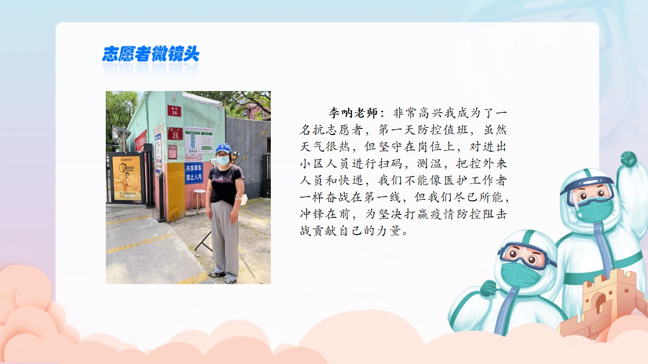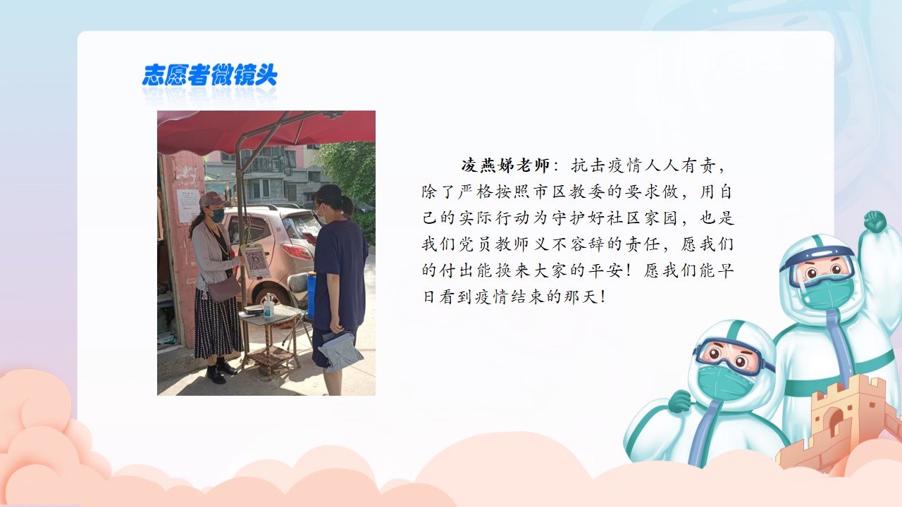 我校在做好线上教育教学工作的同时,党员干部和教师积极下沉社区志愿服务。筑起防控疫情的安全屏障,大家坚守信念、扛起责任、用实际行动践行了“关键时刻冲得上去,危难关头豁得出来”的铿锵誓言;履行了“全心全意为人民服务”的根本宗旨;书写着新时代党员教师的责任担当!