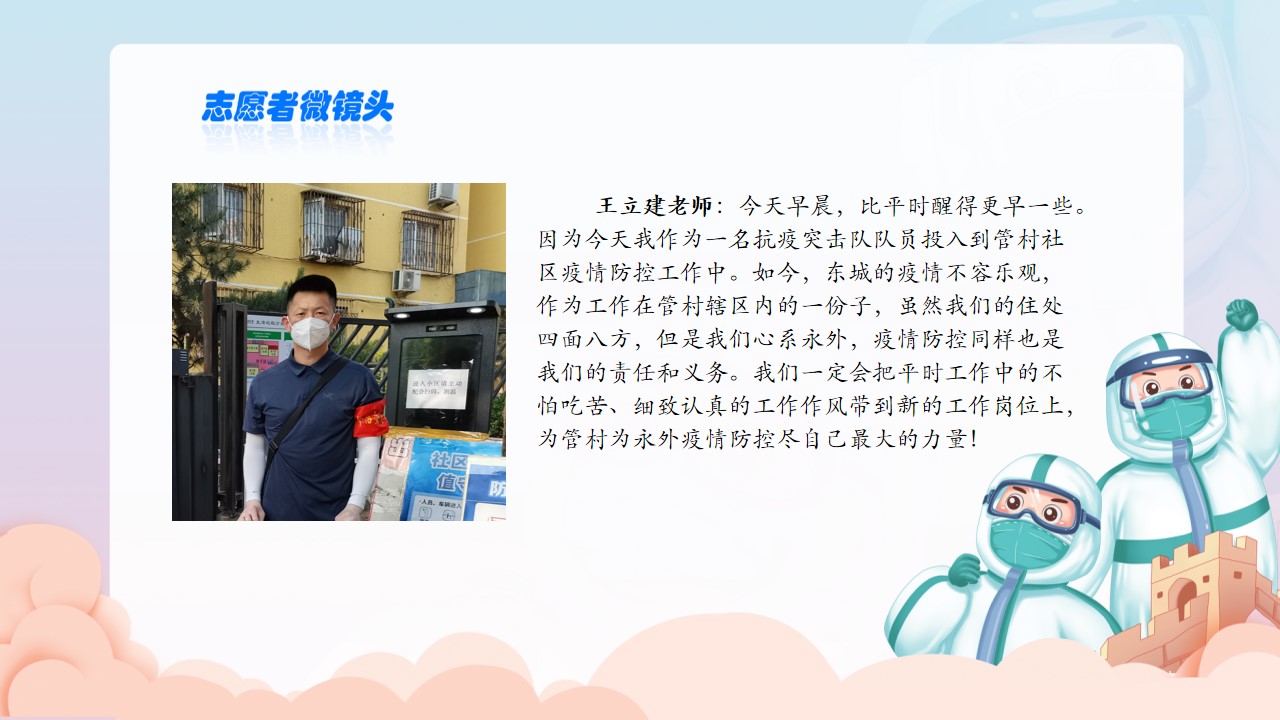 党支部根据工作需要的研判,火速集结10名志愿者成立革小支援社区抗疫突击队,由王立建老师为代表参加“教育系统学校助力永外街道疫情防控工作部署会”