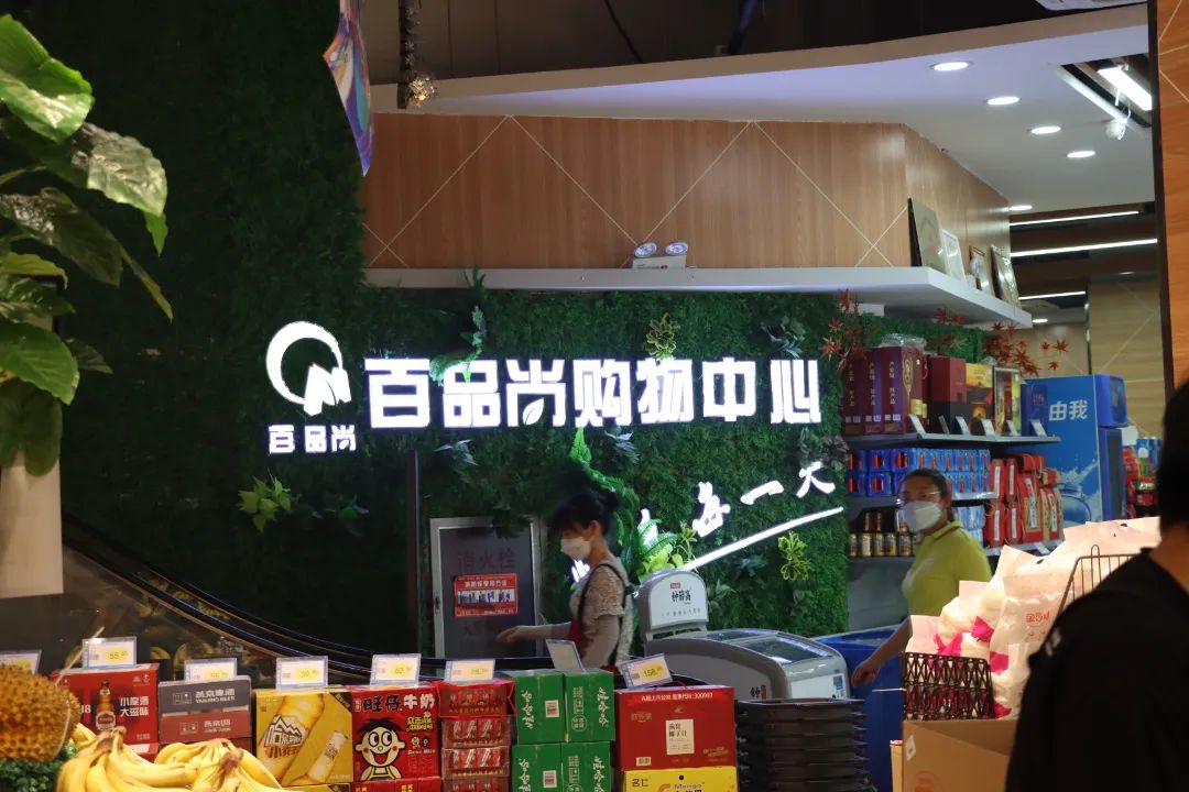 上午8点左右是百品尚购物中心超市购买高峰,市民都佩戴口罩、按照要求进行测温验码,有序按需购买商品。各类货架前,工作人员也及时监测销售情况,随时补充货物,保障居民采买需求。