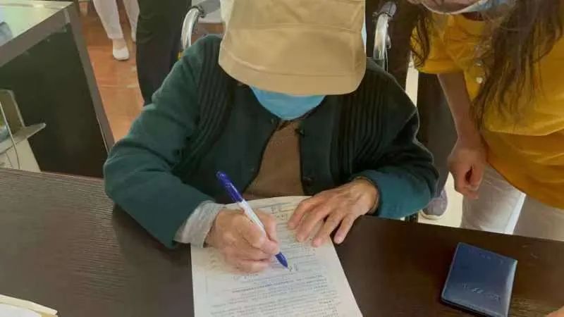 此外,另一位103岁高龄的老人肖晴,在护工的陪同下,经医生健康评估,确认老人的身体无异常、可以正常接种疫苗后,在知情同意书上签了字,也成功接种了第一针疫苗。此外,老人在留观期间表示,要主动向身边群众宣传疫苗接种。