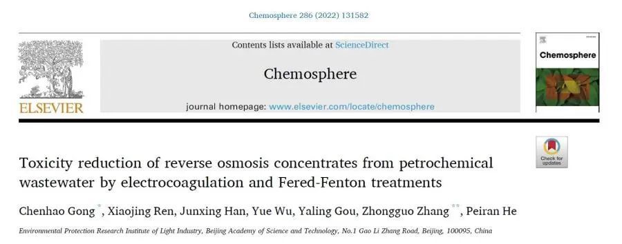 近日,北京市科学技术研究院资源环境研究所在Chemosphere期刊(影响因子7.086/环境科学领域Top期刊)发表了题为“Toxicity reduction of reverse osmosis concentrates from petrochemical wastewater by electrocoagulation and Fered-Fenton treatments”的文章。该研究以高盐、高有机物含量及高毒性的石化反渗透浓水为研究对象,对比分析电絮凝和类芬顿对浓水中毒性有机物的去除效果,揭示了毒性有机物在反应过程中的降解及转化机制,为石化废水行业在水资源高效利用及污染物控制方面提供了有价值的理论及工程指导。