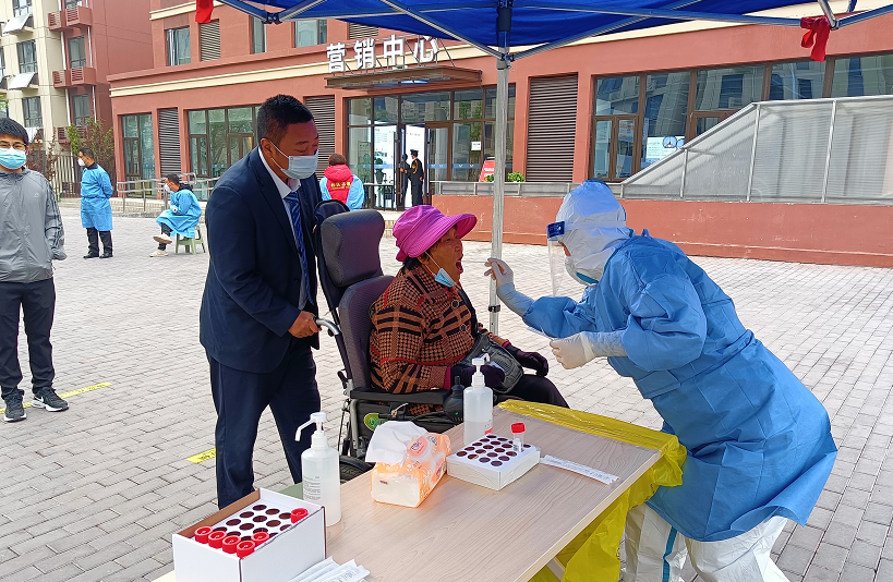 村民何之山患病行动不便,出行大多时候得靠轮椅。一看到何之山的身影,工作人员迅速上前,推着他来到“绿色通道”入口处。测温、扫码、排队、扫描身份证,在工作人员的帮助下,何之山很快完成了核酸采样。其他排队等候的村民,对工作人员关爱特殊人群的做法,也表示了理解和认可。
