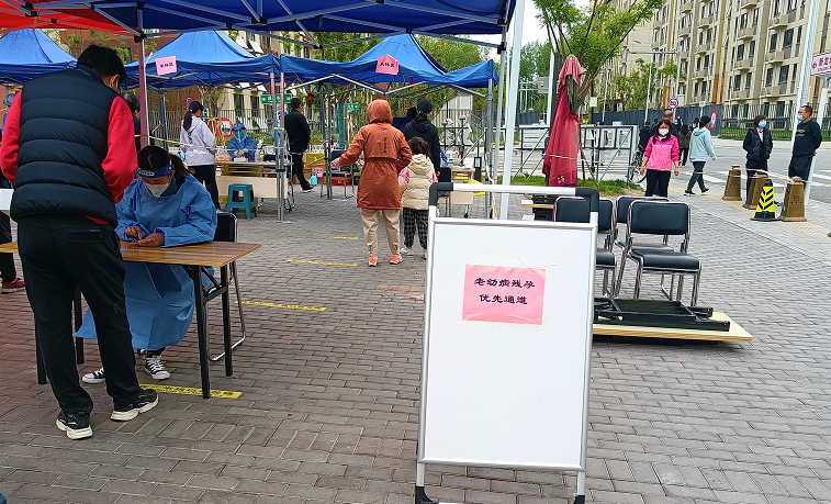 据大柏老村村委会工作人员介绍,大柏老村是旧县镇五个大村之一,有1200余户村民,老年人多,村里还有些残疾人。村里根据实际情况设置了4条核酸采样通道,其中一条通道的入口处,放置着写有“请行动不便人员,上网课大、中、小学生,孕妇在最左侧排队检测”字样的提示牌。平时,这条通道会对所有人开放,一旦有老人、残疾人、孕妇等特殊人群到来,工作人员就会引导他们进入“绿色通道”,并协助他们进行扫码、测温、扫描身份证,方便特殊人群尽快完成核酸采样。